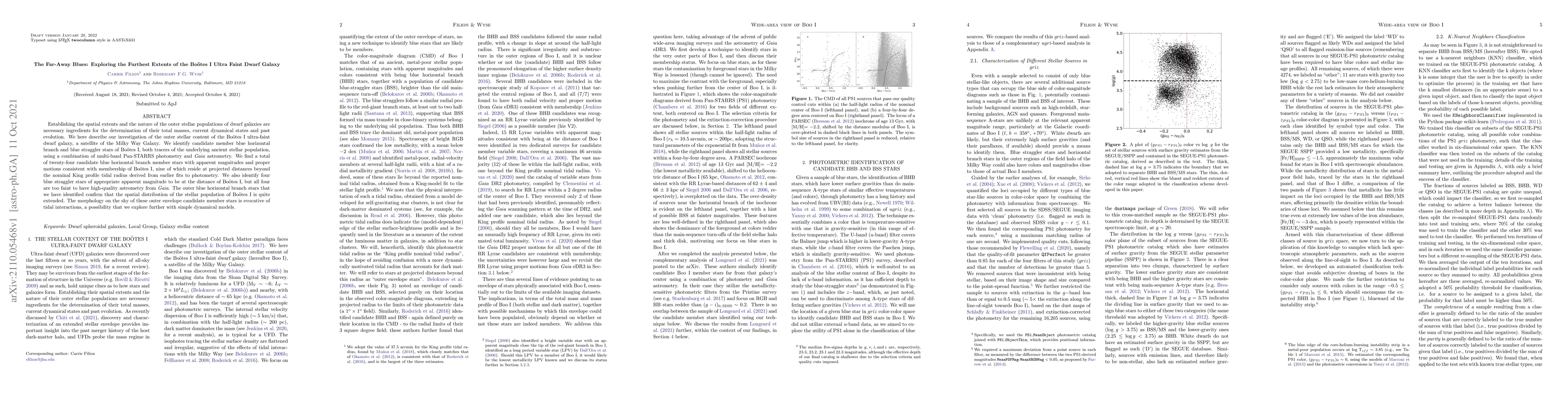 Establishing the spatial extents and the nature of the outer stellar populations of dwarf galaxies are necessary ingredients for the determination of their total masses, current dynamical states and past evolution. We here describe our investigation of the outer stellar content of the Bo\"otes I ultra-faint dwarf galaxy, a satellite of the Milky Way Galaxy. We identify candidate member blue horizontal branch and blue straggler stars of Bo\"otes I, both tracers of the underlying ancient stellar population, using a combination of multi-band Pan-STARRS photometry and Gaia astrometry. We find a total of twenty-four candidate blue horizontal branch member stars with apparent magnitudes and proper motions consistent with membership of Bo\"otes I, nine of which reside at projected distances beyond the nominal King profile tidal radius derived from earlier fits to photometry. We also identify four blue straggler stars of appropriate apparent magnitude to be at the distance of Bo\"otes I, but all four are too faint to have high-quality astrometry from Gaia. The outer blue horizontal branch stars that we have identified confirm that the spatial distribution of the stellar population of Bo\"otes I is quite extended. The morphology on the sky of these outer envelope candidate member stars is evocative of tidal interactions, a possibility that we explore further with simple dynamical models.