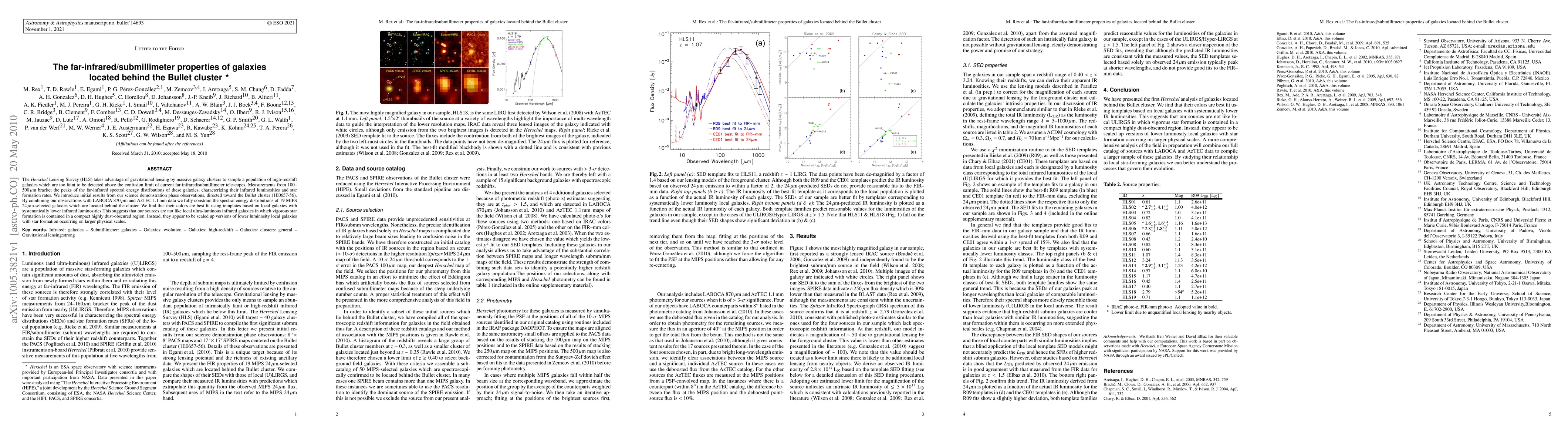 The Herschel Lensing Survey (HLS) takes advantage of gravitational lensing by massive galaxy clusters to sample a population of high-redshift galaxies which are too faint to be detected above the confusion limit of current far-infrared/submillimeter telescopes. Measurements from 100-500 micron bracket the peaks of the far-infrared spectral energy distributions of these galaxies, characterizing their infrared luminosities and star formation rates. We introduce initial results from our science demonstration phase observations, directed toward the Bullet cluster (1E0657-56). By combining our observations with LABOCA 870 micron and AzTEC 1.1 mm data we fully constrain the spectral energy distributions of 19 MIPS 24 micron selected galaxies which are located behind the cluster. We find that their colors are best fit using templates based on local galaxies with systematically lower infrared luminosities.This suggests that our sources are not like local ultra-luminous infrared galaxies in which vigorous star formation is contained in a compact highly dust-obscured region. Instead, they appear to be scaled up versions of lower luminosity local galaxies with star formation occurring on larger physical scales.