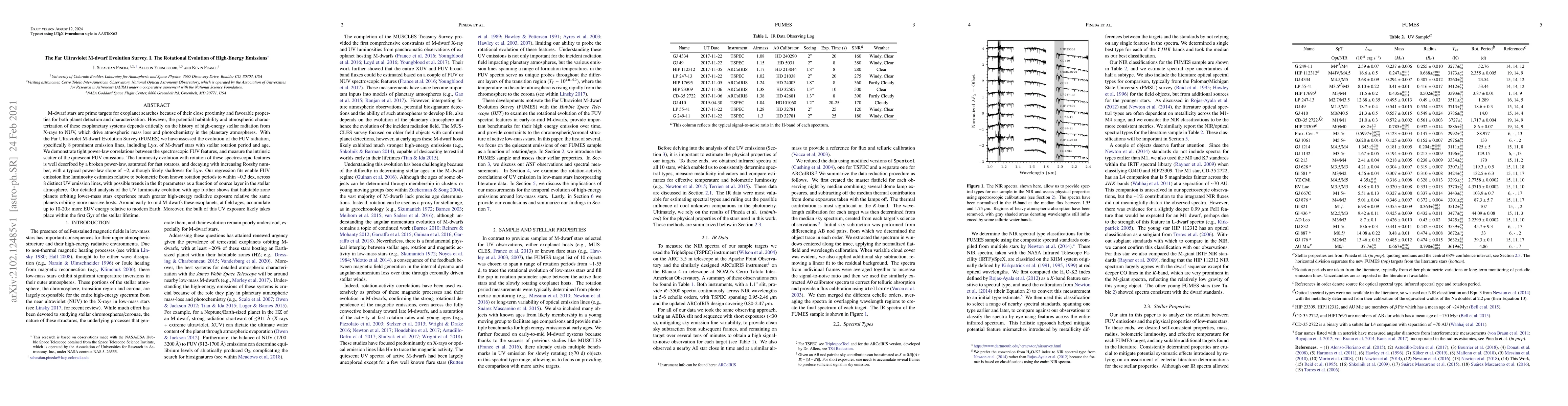 The Far Ultraviolet M-dwarf Evolution Survey (FUMES) investigates the rotational evolution of high-energy emissions from M-dwarf stars, revealing tight power-law correlations between FUV emission lines and stellar rotation. The study shows that lower-mass stars expose their exoplanets to significantly higher levels of EUV radiation, especially within the first billion years of their lifetimes.