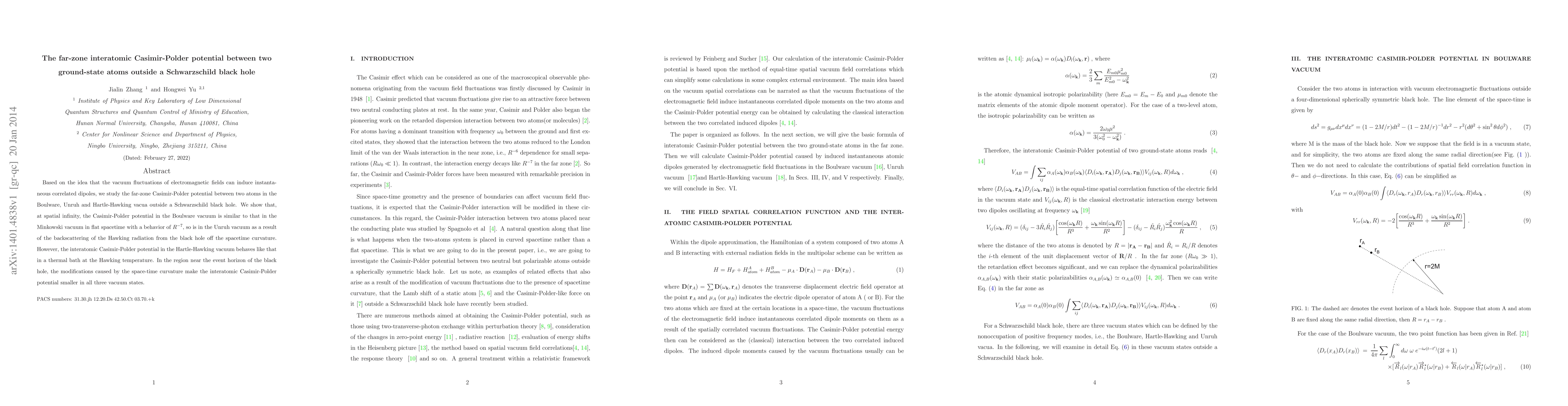 This paper investigates the far-zone Casimir-Polder potential between two ground-state atoms outside a Schwarzschild black hole in different vacua. It finds that the potential behaves similarly to flat spacetime in the Boulware and Unruh vacua, but like a thermal bath at the Hawking temperature in the Hartle-Hawking vacuum. Near the event horizon, the potential is reduced due to spacetime curvature.
