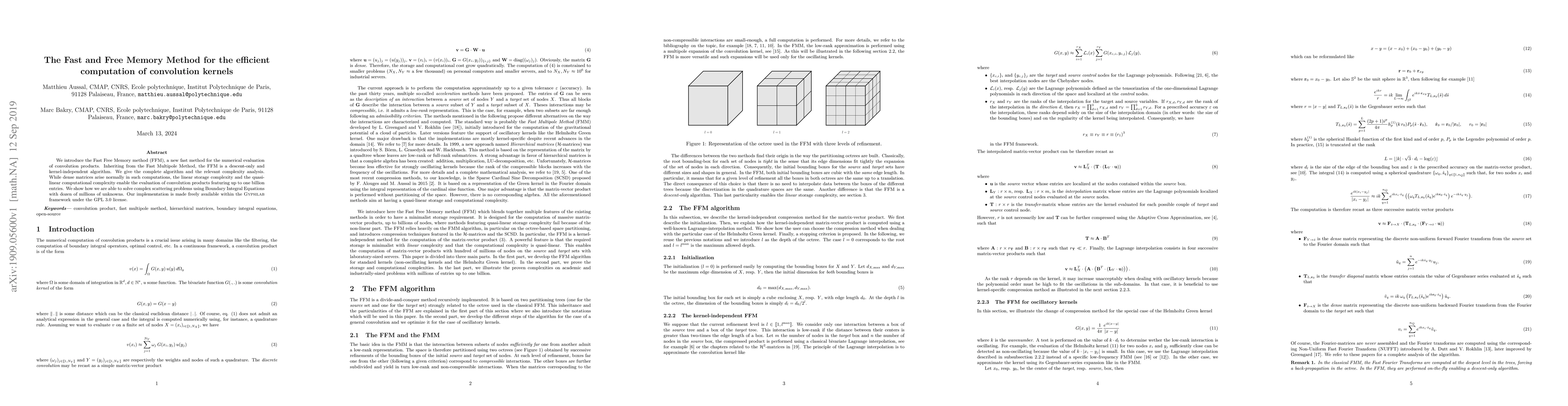 The Fast Free Memory (FFM) method is a novel, descent-only, and kernel-independent algorithm for efficiently computing convolution kernels, inheriting from the Fast Multipole Method. It offers linear storage and computational complexity, enabling the evaluation of convolution products with up to one billion entries and solving complex scattering problems using Boundary Integral Equations.