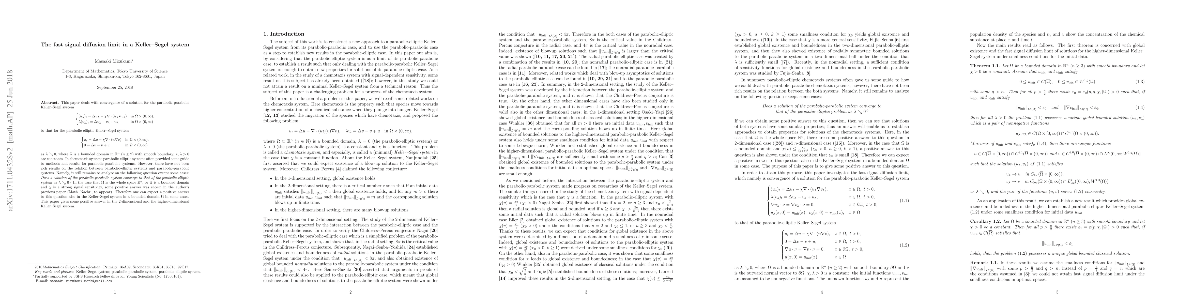 This paper deals with convergence of a solution for the parabolic-parabolic Keller-Segel system \[ (u_\lambda)_t = \Delta u_\lambda - \chi \nabla \cdot (u_\lambda \nabla v_\lambda), \quad \lambda (v_\lambda)_t = \Delta v_\lambda - v_\lambda + u_\lambda \quad \mbox{in} \ \Omega\times (0,\infty) \] to that for the parabolic-elliptic Keller-Segel system \[ u_t = \Delta u - \chi \nabla \cdot (u \nabla v), \quad 0= \Delta v -v +u \quad \mbox{in} \ \Omega\times (0,\infty) \] as $\lambda \searrow 0$, where $\Omega$ is a bounded domain in $\mathbb{R}^n$ ($n\ge 2$) with smooth boundary, $\chi, \lambda>0$ are constants. In chemotaxis systems parabolic-elliptic systems often provided some guide to methods and results for parabolic-parabolic systems. However, there have not been rich results on the relation between parabolic-elliptic systems and parabolic-parabolic systems. Namely, it still remains to analyze on the following question except some cases: Does a solution of the parabolic-parabolic system converge to that of the parabolic-elliptic system as $\lambda \searrow 0$? In the case that $\Omega$ is the whole space $\mathbb{R}^n$, or $\Omega$ is a bounded domain and $\chi$ is a strong signal sensitivity, some positive answers were shown in the previous works. Therefore, one can expect a positive answer to this question also in the Keller-Segel system in a bounded domain $\Omega$ in some cases. This paper gives some positive answer in the 2-dimensional and the higher-dimensional Keller-Segel system.