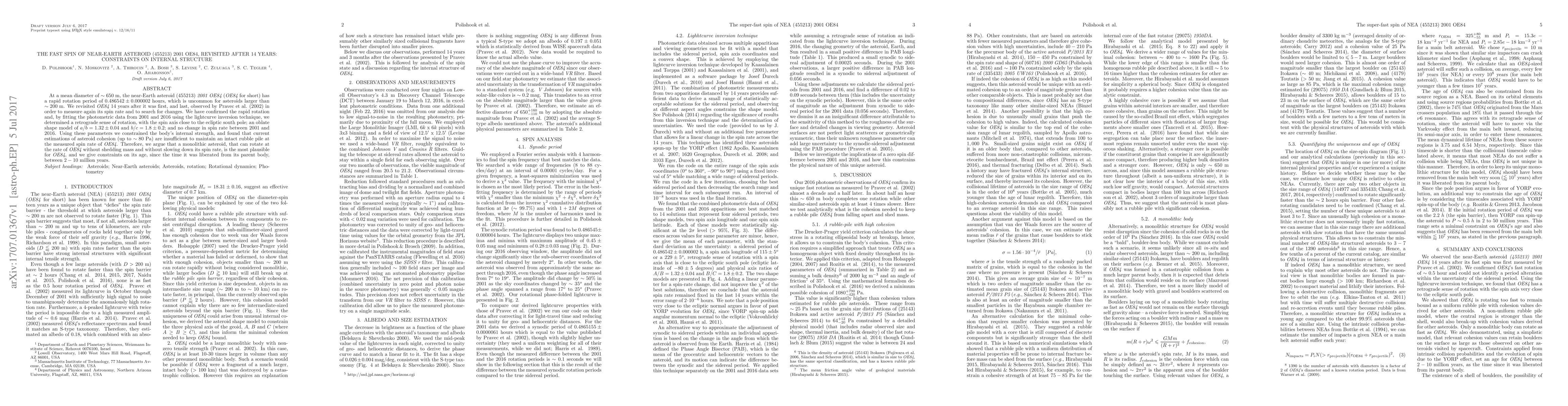 At a mean diameter of ~650 m, the near-Earth asteroid (455213) 2001 OE84 (OE84 for short) has a rapid rotation period of 0.486542+-0.000002 hours, which is uncommon for asteroids larger than ~200 m. We revisited OE84 14 years after it was first, and last, observed by Pravec et al. (2002) in order to measure again its spin rate and to search for changes. We have confirmed the rapid rotation and, by fitting the photometric data from 2001 and 2016 using the lightcurve inversion technique, we determined a retrograde sense of rotation, with the spin axis close to the ecliptic south pole; an oblate shape model of a/b=1.32+-0.04 and b/c=1.8+-0.2; and no change in spin rate between 2001 and 2016. Using these parameters we constrained the body's internal strength, and found that current estimations of asteroid cohesion (up to ~80 Pa) are insufficient to maintain an intact rubble pile at the measured spin rate of OE84. Therefore, we argue that a monolithic asteroid, that can rotate at the rate of OE84 without shedding mass and without slowing down its spin rate, is the most plausible for OE84, and we give constraints on its age, since the time it was liberated from its parent body, between 2-10 million years.