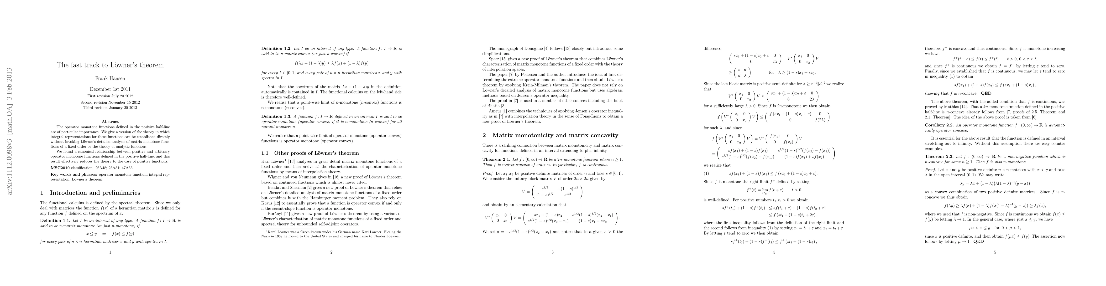 This paper presents a streamlined approach to establishing integral representations for operator monotone functions on the positive half-line, bypassing Lowner's detailed matrix analysis and analytic function theory. It establishes a canonical relationship reducing the theory to positive functions.