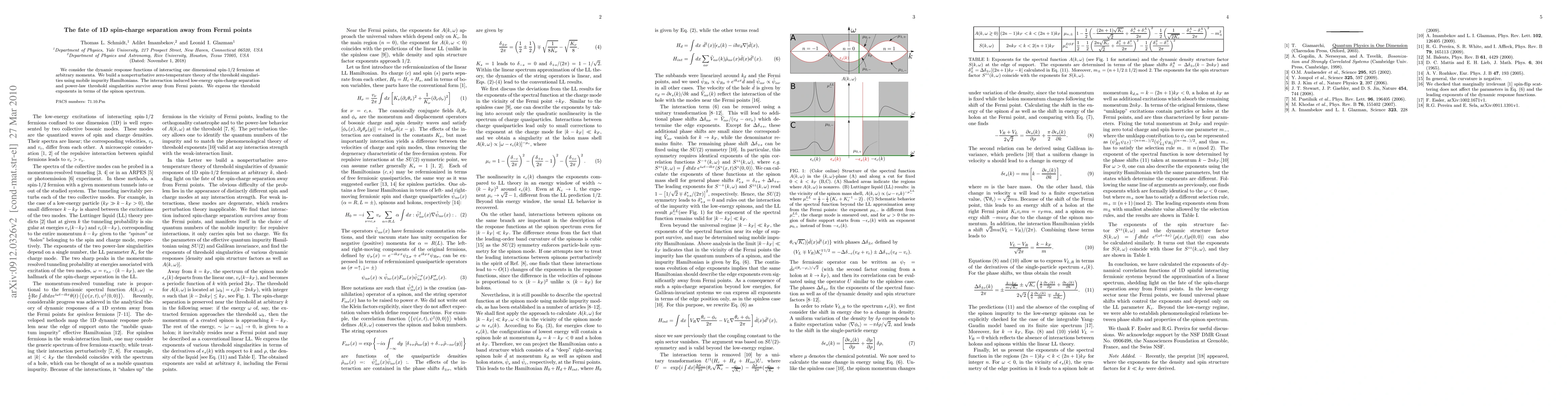 Researchers developed a non-perturbative theory to study 1D spin-charge separation in interacting fermions away from Fermi points. They found that this phenomenon persists even at low temperatures, with interactions inducing power-law threshold singularities that can be described by the spinon spectrum.