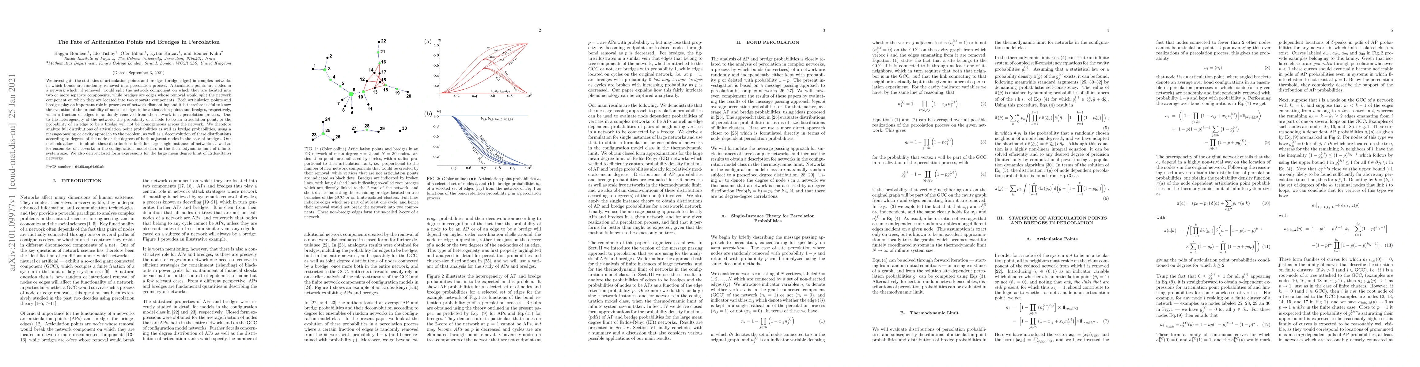 We investigate the statistics of articulation points and bredges (bridge-edges) in complex networks in which bonds are randomly removed in a percolation process. Articulation points are nodes in a network which, if removed, would split the network component on which they are located into two or more separate components, while bredges are edges whose removal would split the network component on which they are located into two separate components. Both articulation points and bredges play an important role in processes of network dismantling and it is therefore useful to know the evolution of the probability of nodes or edges to be articulation points and bredges, respectively, when a fraction of edges is randomly removed from the network in a percolation process. Due to the heterogeneity of the network, the probability of a node to be an articulation point, or the probability of an edge to be a bredge will not be homogeneous across the network. We therefore analyze full distributions of articulation point probabilities as well as bredge probabilities, using a message-passing or cavity approach to the problem, as well as a deconvolution of these distributions according to degrees of the node or the degrees of both adjacent nodes in the case of bredges. Our methods allow us to obtain these distributions both for large single instances of networks as well as for ensembles of networks in the configuration model class in the thermodynamic limit of infinite system size. We also derive closed form expressions for the large mean degree limit of Erd\H{o}s-R\'enyi networks.