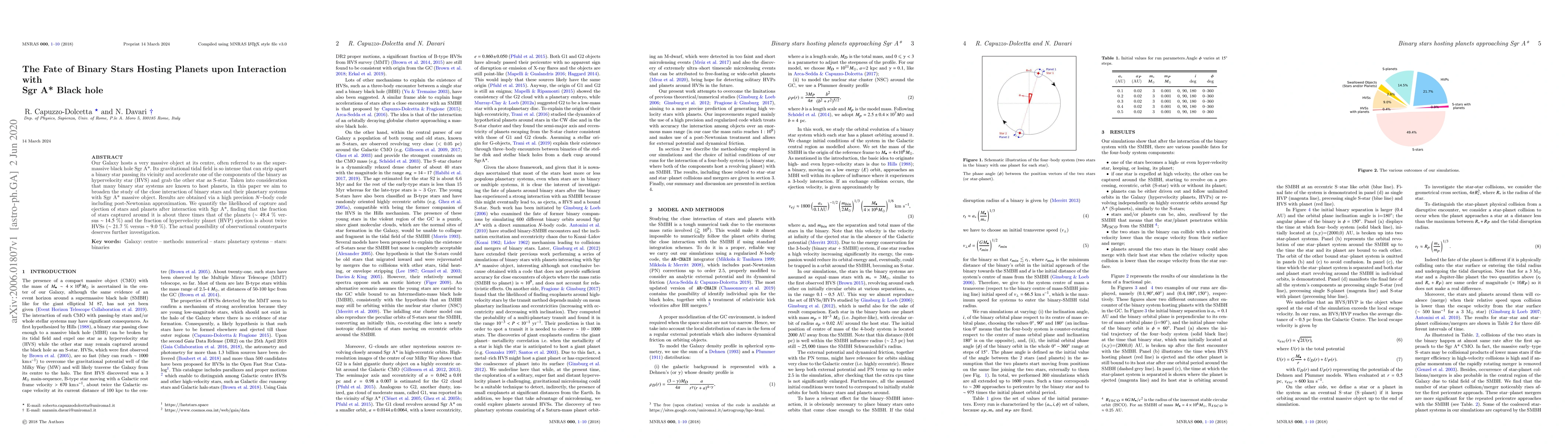 This paper investigates the impact of the supermassive black hole Sgr A* on binary star systems hosting planets, finding that stars are three times more likely to be captured than planets, and hypervelocity planet ejection is twice as likely as star ejection. The results are derived from high precision $N-$body simulations.