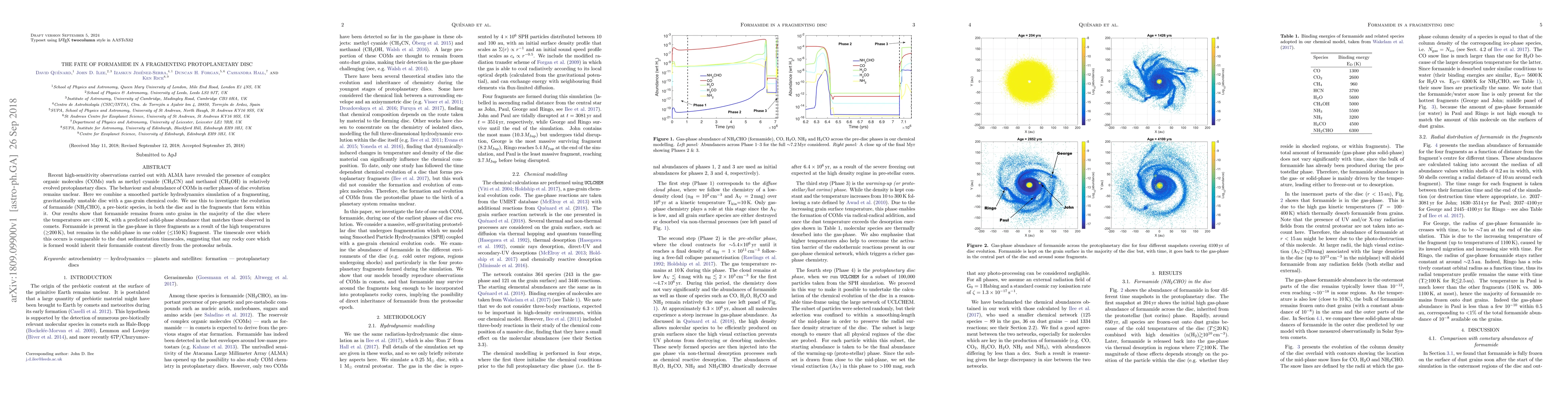 Recent high-sensitivity observations carried out with ALMA have revealed the presence of complex organic molecules (COMs) such as methyl cyanide (CH$_{\rm 3}$CN) and methanol (CH$_{\rm 3}$OH) in relatively evolved protoplanetary discs. The behaviour and abundance of COMs in earlier phases of disc evolution remains unclear. Here we combine a smoothed particle hydrodynamics simulation of a fragmenting, gravitationally unstable disc with a gas-grain chemical code. We use this to investigate the evolution of formamide (NH$_{\rm 2}$CHO), a pre-biotic species, in both the disc and in the fragments that form within it. Our results show that formamide remains frozen onto grains in the majority of the disc where the temperatures are $<$100 K, with a predicted solid-phase abundance that matches those observed in comets. Formamide is present in the gas-phase in three fragments as a result of the high temperatures ($\geq$200\,K), but remains in the solid-phase in one colder ($\leq$150 K) fragment. The timescale over which this occurs is comparable to the dust sedimentation timescales, suggesting that any rocky core which is formed would inherit their formamide content directly from the protosolar nebula.