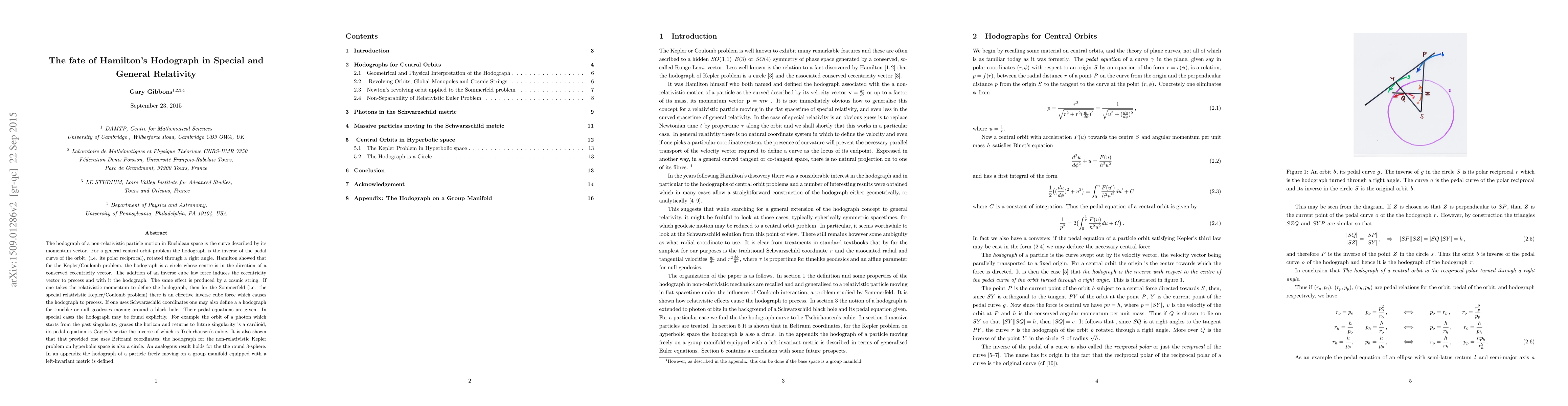 The hodograph of a non-relativistic particle motion in Euclidean space is the curve described by its momentum vector. For a general central orbit problem the hodograph is the inverse of the pedal curve of the orbit, (i.e. its polar reciprocal), rotated through a right angle. Hamilton showed that for the Kepler/Coulomb problem, the hodograph is a circle whose centre is in the direction of a conserved eccentricity vector. The addition of an inverse cube law force induces the eccentricity vector to precess and with it the hodograph. The same effect is produced by a cosmic string. If one takes the relativistic momentum to define the hodograph, then for the Sommerfeld (i.e. the special relativistic Kepler/Coulomb problem) there is an effective inverse cube force which causes the hodograph to precess. If one uses Schwarzschild coordinates one may also define a a hodograph for timelike or null geodesics moving around a black hole. Iheir pedal equations are given. In special cases the hodograph may be found explicitly. For example the orbit of a photon which starts from the past singularity, grazes the horizon and returns to future singularity is a cardioid, its pedal equation is Cayley's sextic the inverse of which is Tschirhausen's cubic. It is also shown that that provided one uses Beltrami coordinates, the hodograph for the non-relativistic Kepler problem on hyperbolic space is also a circle. An analogous result holds for the the round 3-sphere. In an appendix the hodograph of a particle freely moving on a group manifold equipped with a left-invariant metric is defined.