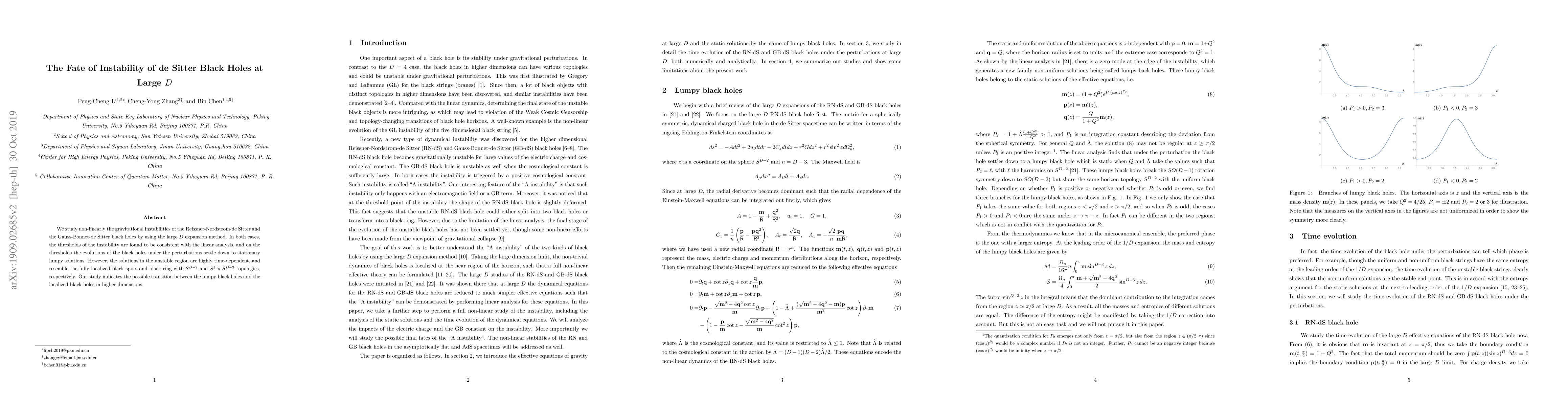 Researchers studied gravitational instabilities in de Sitter black holes using a large D expansion method, finding thresholds consistent with linear analysis but unstable solutions resembling localized black spots and rings.