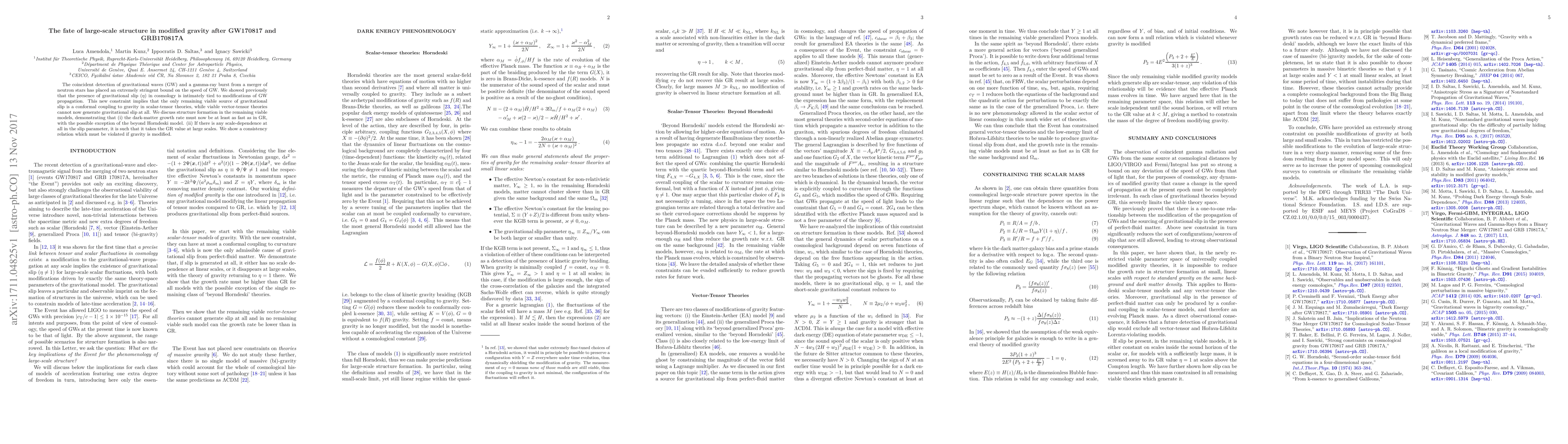 This paper examines the impact of the GW170817 and GRB170817A detection on modified gravity theories, concluding that only conformal coupling in scalar-tensor models can still allow for gravitational slip. It finds that dark-matter growth must match or exceed General Relativity rates, with large scales approaching GR values.