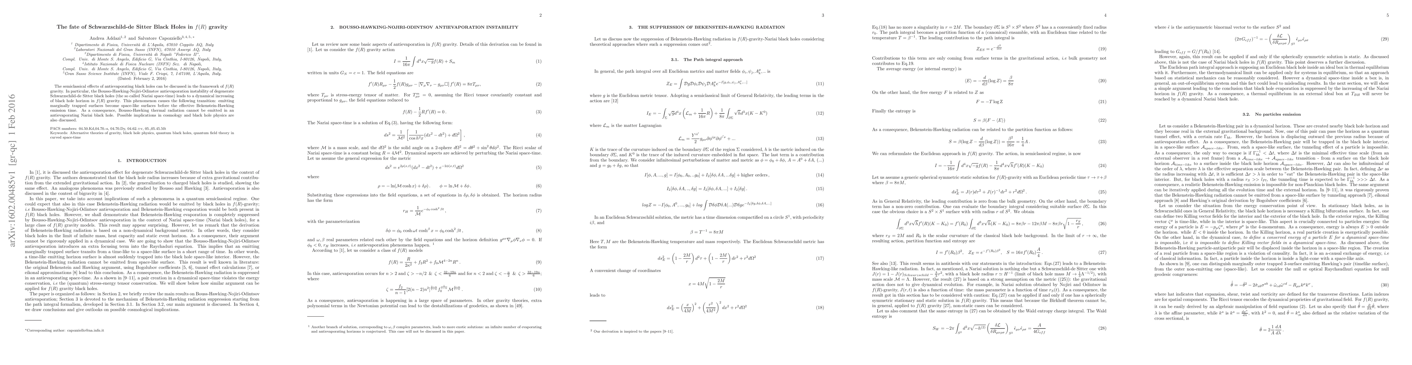 The semiclassical effects of antievaporating black holes can be discussed in the framework of $f(R)$ gravity. In particular, the Bousso-Hawking-Nojiri-Odinstov antievaporation instability of degenerate Schwarzschild-de Sitter black holes (the so called Nariai space-time) leads to a dynamical increasing of black hole horizon in $f(R)$ gravity. This phenomenon causes the following transition: emitting marginally trapped surfaces become space-like surfaces before the effective Bekenstein-Hawking emission time. As a consequence, Bousso-Hawking thermal radiation cannot be emitted in an antievaporating Nariai black hole. Possible implications in cosmology and black hole physics are also discussed.