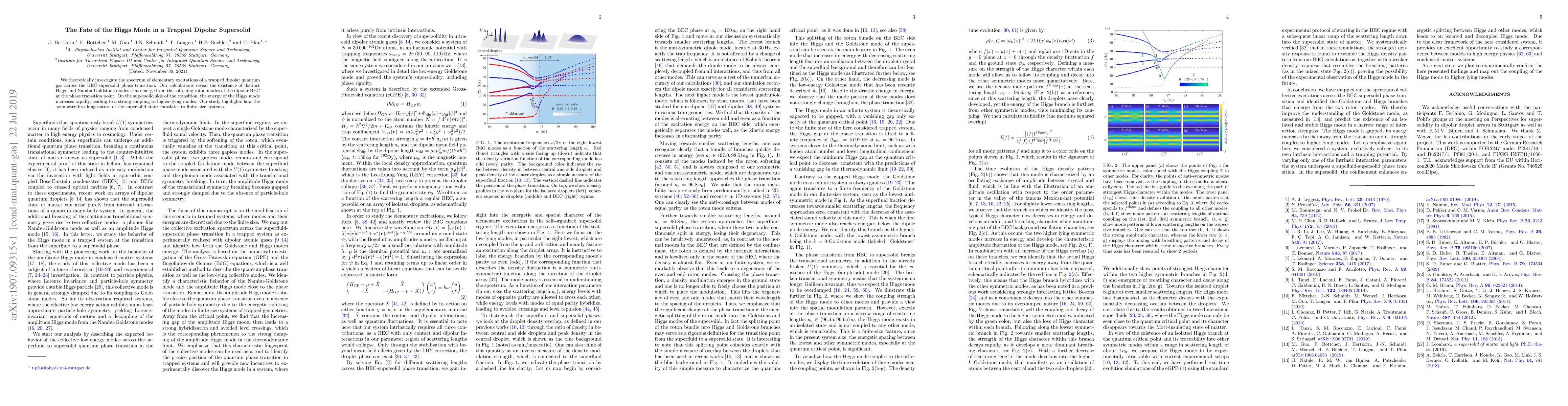 This paper investigates the spectrum of excitations in a trapped dipolar quantum gas undergoing a BEC-supersolid phase transition, revealing distinct Higgs and Nambu-Goldstone modes. The Higgs mode's energy increases sharply on the supersolid side, indicating strong coupling to higher modes and highlighting the symmetry-breaking nature of the supersolid state.