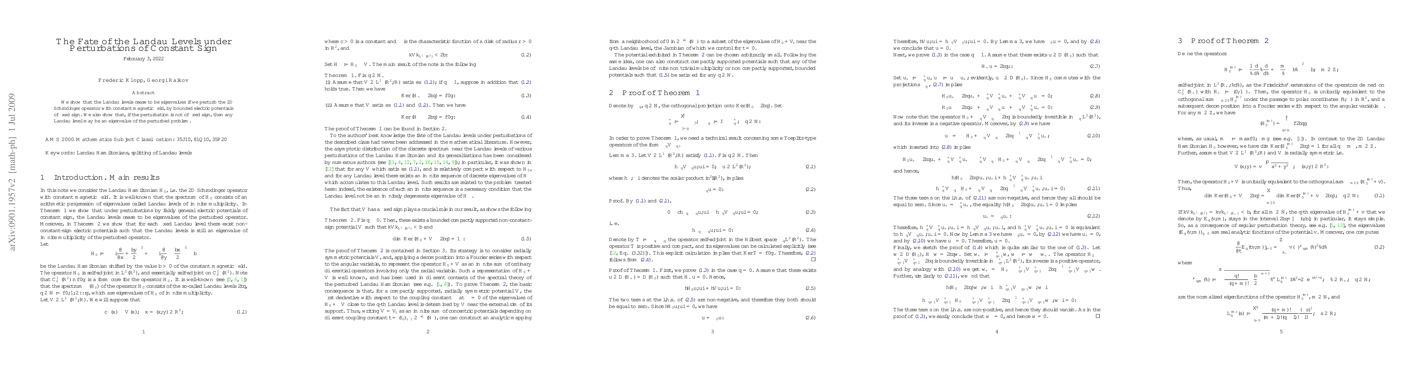 We show that the Landau levels cease to be eigenvalues if we perturb the 2D Schr\"odinger operator with constant magnetic field, by bounded electric potentials of fixed sign. We also show that, if the perturbation is not of fixed sign, then any Landau level may be an eigenvalue of arbitrary large, finite or infinite, multiplicity of the perturbed problem.