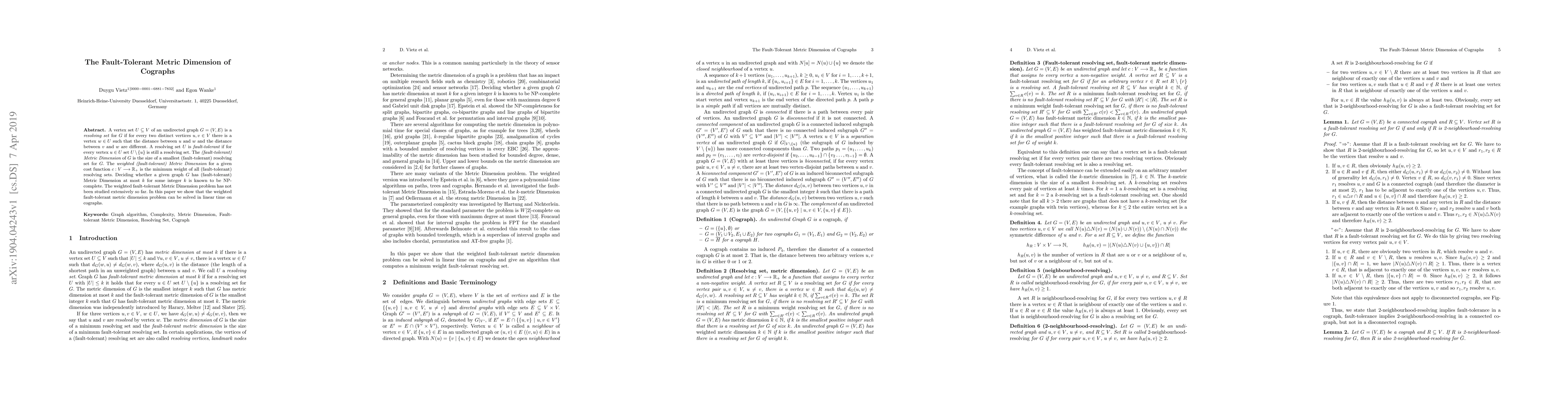 This paper investigates the fault-tolerant metric dimension in cographs, demonstrating that the weighted fault-tolerant metric dimension can be computed in linear time. It resolves an NP-complete problem by providing an efficient solution for cographs.