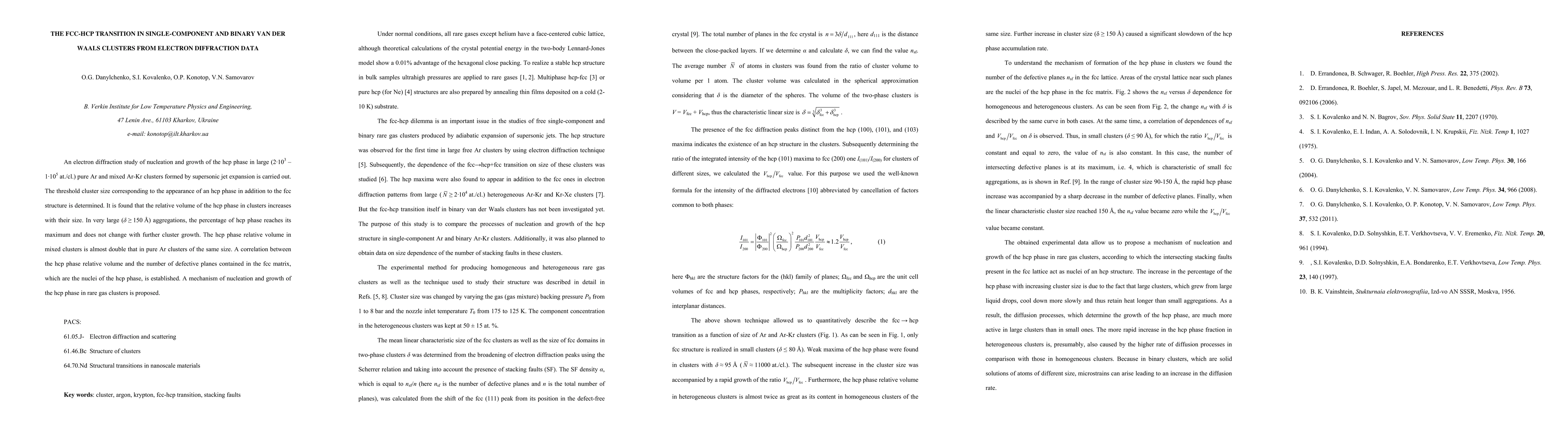 An electron diffraction study of nucleation and growth of the hcp phase in large pure Ar and mixed Ar-Kr clusters formed by supersonic jet expansion is carried out. The threshold cluster size corresponding to the appearance of an hcp phase in addition to the fcc structure is determined. It is found that the relative volume of the hcp phase in clusters increases with their size. In very large aggregations, the percentage of hcp phase reaches its maximum and does not change with further cluster growth. The hcp phase relative volume in mixed clusters is almost double that in pure Ar clusters of the same size. A correlation between the hcp phase relative volume and the number of defective planes contained in the fcc matrix, which are the nuclei of the hcp phase, is established. A mechanism of nucleation and growth of the hcp phase in rare gas clusters is proposed.