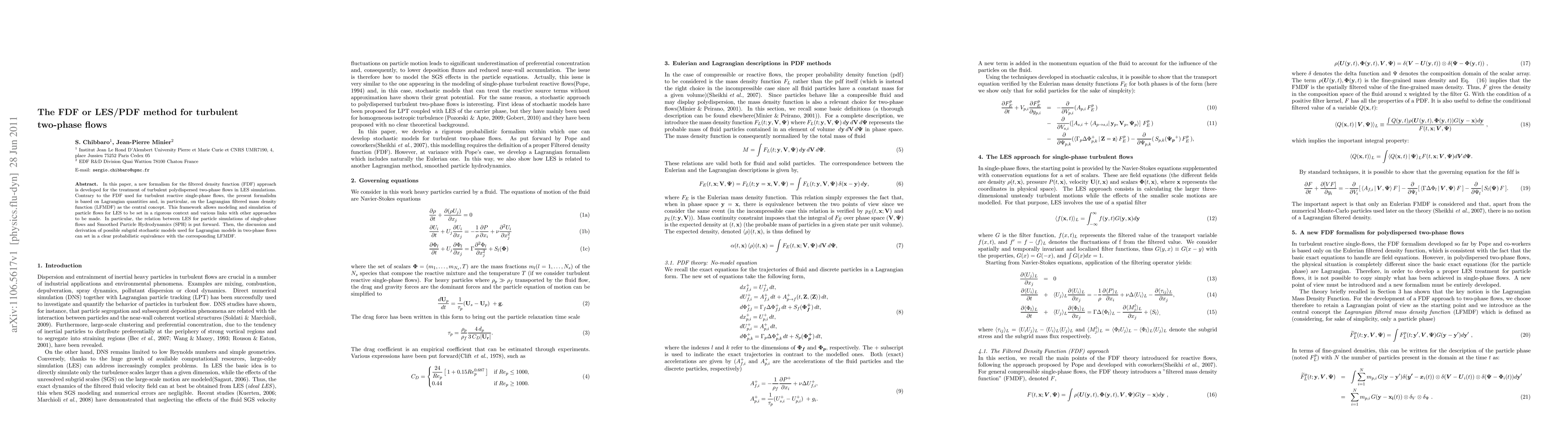 This paper introduces a new formalism for the filtered density function (FDF) approach to simulate turbulent polydispersed two-phase flows in LES, emphasizing the use of Lagrangian quantities and the Lagrangian filtered mass density function (LFMDF). It establishes a rigorous framework for particle flow modeling and highlights connections to Smoothed Particle Hydrodynamics (SPH) and subgrid stochastic models.