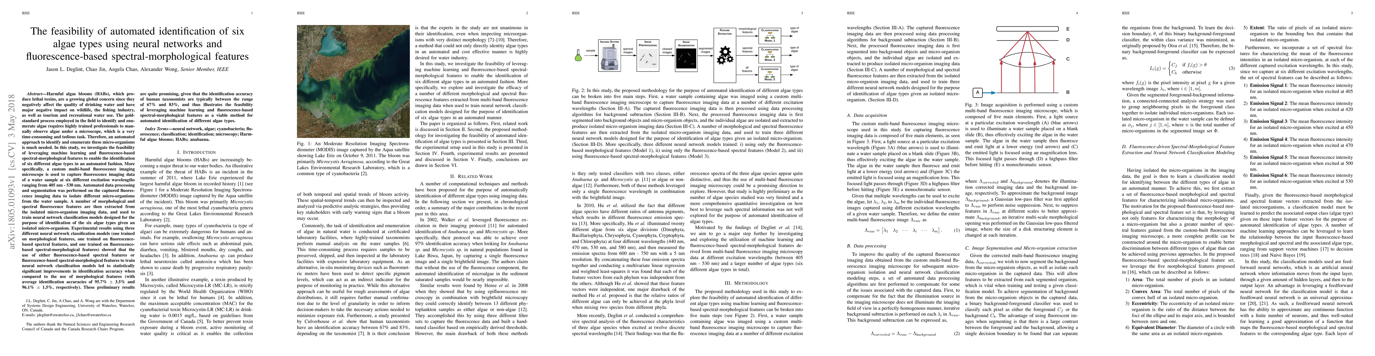 This study explores the use of neural networks and fluorescence-based spectral-morphological features for automated identification of six harmful algae types. Results from neural network models show significant improvements in accuracy (95.7%±3.5% to 96.1%±1.5%) compared to human taxonomists, indicating the potential of this method for effective algae bloom detection.