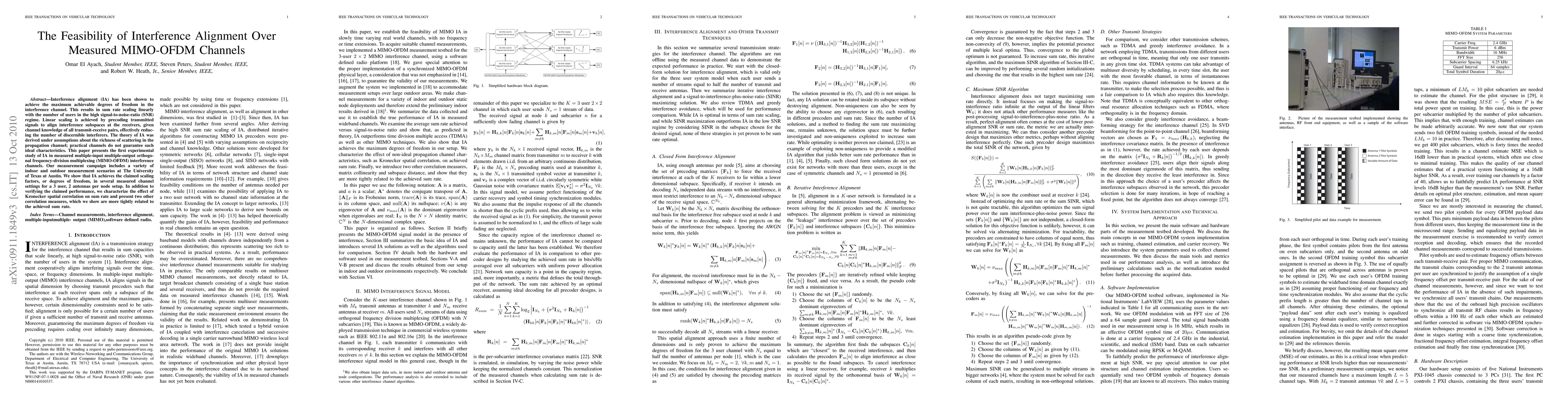Interference alignment (IA) has been shown to achieve the maximum achievable degrees of freedom in the interference channel. This results in sum rate scaling linearly with the number of users in the high signal-to-noise-ratio (SNR) regime. Linear scaling is achieved by precoding transmitted signals to align interference subspaces at the receivers, given channel knowledge of all transmit-receive pairs, effectively reducing the number of discernible interferers. The theory of IA was derived under assumptions about the richness of scattering in the propagation channel; practical channels do not guarantee such ideal characteristics. This paper presents the first experimental study of IA in measured multiple-input multiple-output orthogonal frequency-division multiplexing (MIMO-OFDM) interference channels. Our measurement campaign includes a variety of indoor and outdoor measurement scenarios at The University of Texas at Austin. We show that IA achieves the claimed scaling factors, or degrees of freedom, in several measured channel settings for a 3 user, 2 antennas per node setup. In addition to verifying the claimed performance, we characterize the effect of Kronecker spatial correlation on sum rate and present two other correlation measures, which we show are more tightly related to the achieved sum rate.