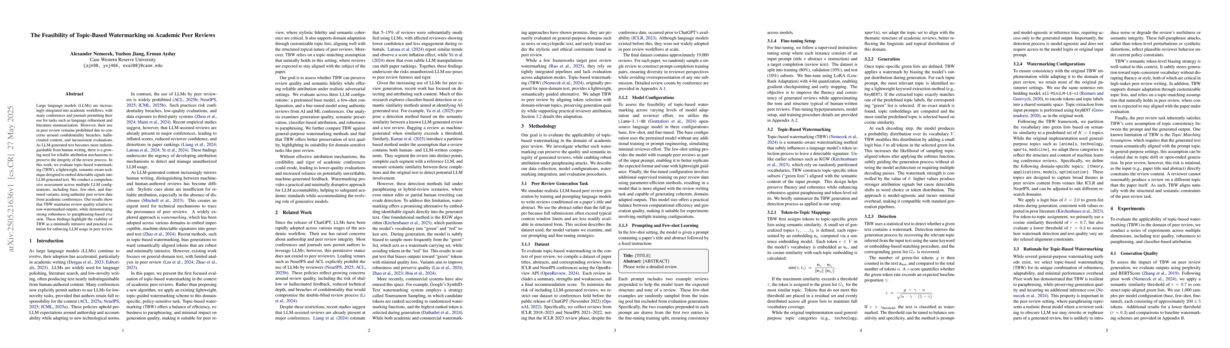 Researchers evaluate topic-based watermarking as a solution to enable peer review with large language models, finding it maintains review quality while being robust against evasion attempts.