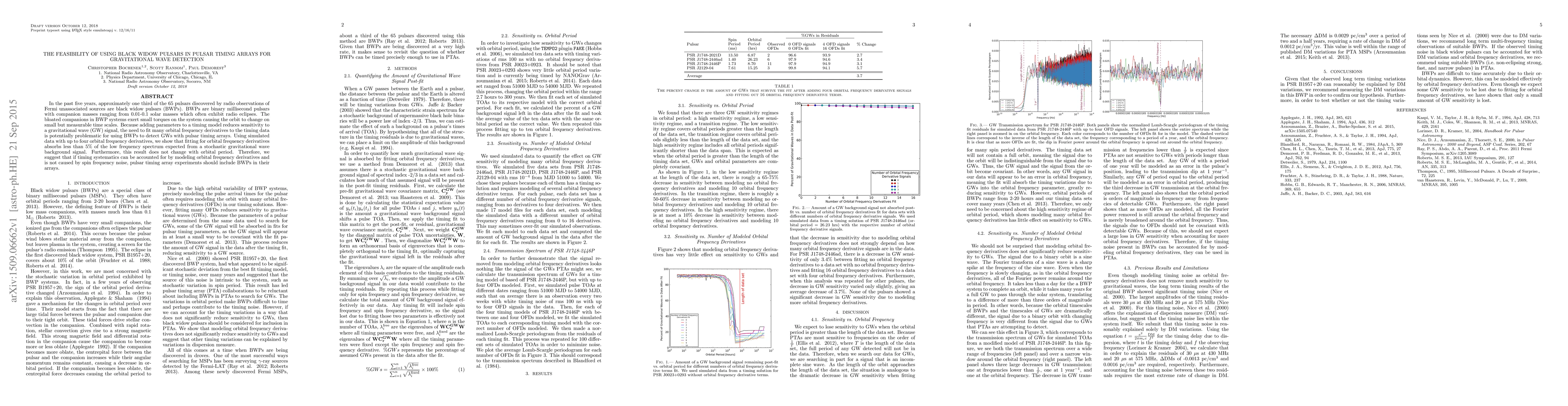 This paper investigates the potential of black widow pulsars (BWPs) in pulsar timing arrays for gravitational wave detection. Despite the need to fit orbital parameters, which can reduce sensitivity, the study finds that BWPs can still absorb less than 5% of the low-frequency gravitational wave spectrum, suggesting their inclusion in pulsar timing arrays is feasible.