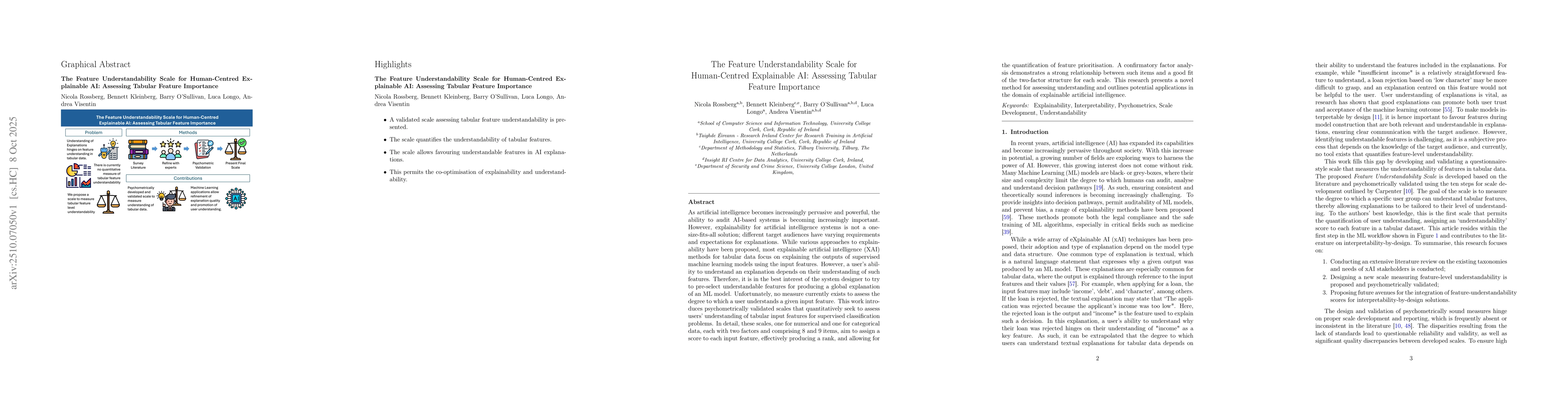 As artificial intelligence becomes increasingly pervasive and powerful, the ability to audit AI-based systems is becoming increasingly important. However, explainability for artificial intelligence systems is not a one-size-fits-all solution; different target audiences have varying requirements and expectations for explanations. While various approaches to explainability have been proposed, most explainable artificial intelligence (XAI) methods for tabular data focus on explaining the outputs of supervised machine learning models using the input features. However, a user's ability to understand an explanation depends on their understanding of such features. Therefore, it is in the best interest of the system designer to try to pre-select understandable features for producing a global explanation of an ML model. Unfortunately, no measure currently exists to assess the degree to which a user understands a given input feature. This work introduces psychometrically validated scales that quantitatively seek to assess users' understanding of tabular input features for supervised classification problems. In detail, these scales, one for numerical and one for categorical data, each with two factors and comprising 8 and 9 items, aim to assign a score to each input feature, effectively producing a rank, and allowing for the quantification of feature prioritisation. A confirmatory factor analysis demonstrates a strong relationship between such items and a good fit of the two-factor structure for each scale. This research presents a novel method for assessing understanding and outlines potential applications in the domain of explainable artificial intelligence.