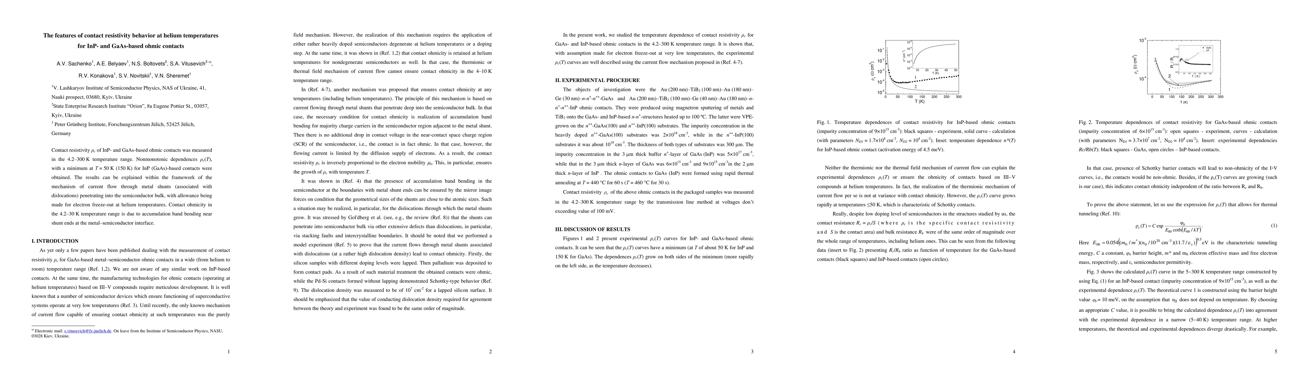 Contact resistivity rc of InP and GaAs based ohmic contacts was measured in the 4.2/300 K temperature range. Nonmonotonic dependences rc(T), with a minimum at temperature 50 K (150 K) for InP (GaAs) based contacts were obtained. The results can be explained within the framework of the mechanism of current flow through metal shunts (associated with dislocations) penetrating into the semiconductor bulk, with allowance being made for electron freeze-out at helium temperatures. Contact ohmicity in the 4.2/30K temperature range is due to accumulation band bending near shunt ends at the metal/semiconductor interface.