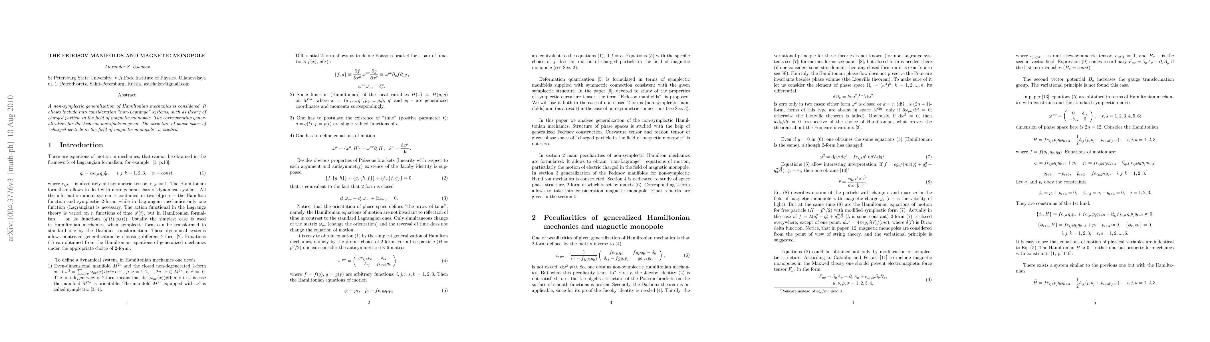 A non-symplectic generalization of Hamiltonian mechanics is considered. It allows include into consideration "non-Lagrange" systems, such as theory of charged particle in the field of magnetic monopole. The corresponding generalization for the Fedosov manifolds is given. The structure of phase space of "charged particle in the field of magnetic monopole" is studied.