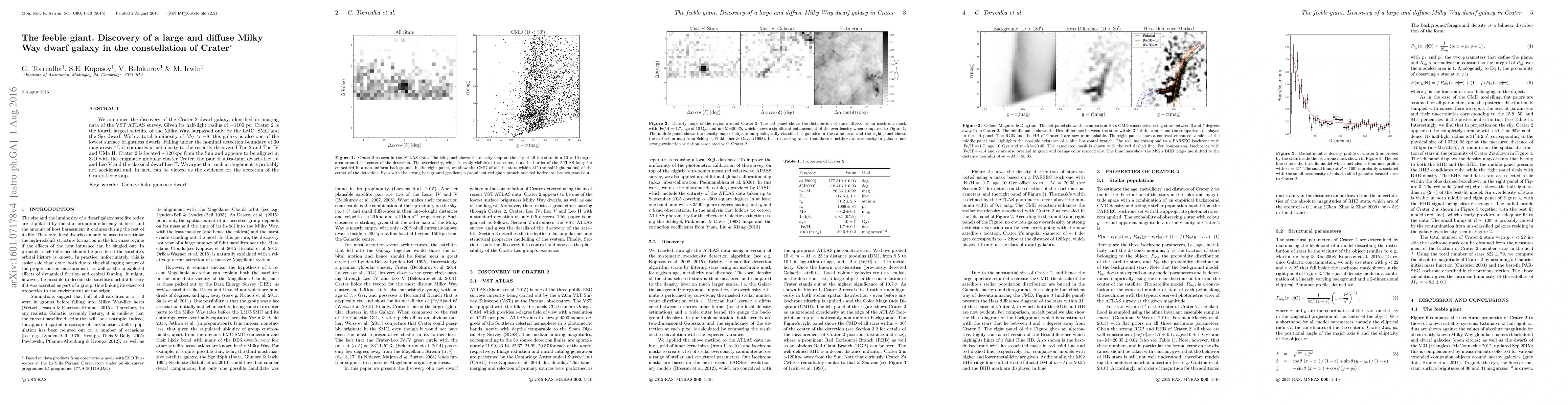 The Crater 2 dwarf galaxy, discovered in the VST ATLAS survey, is the fourth largest Milky Way satellite with a half-light radius of ~1100 pc and a low surface brightness. Its alignment with other nearby celestial objects suggests it may be part of the Crater-Leo group, indicating possible accretion.