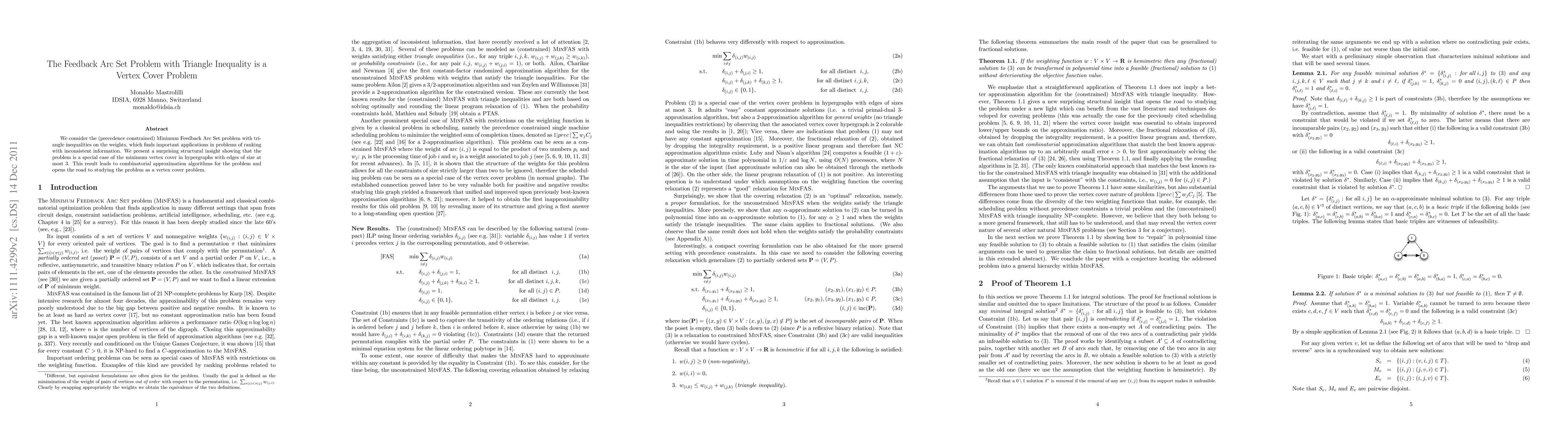 This paper explores the Minimum Feedback Arc Set problem under precedence constraints and triangle inequality weight conditions, revealing it as a special case of the minimum vertex cover in hypergraphs. It provides combinatorial approximation algorithms and suggests new avenues for studying the problem.