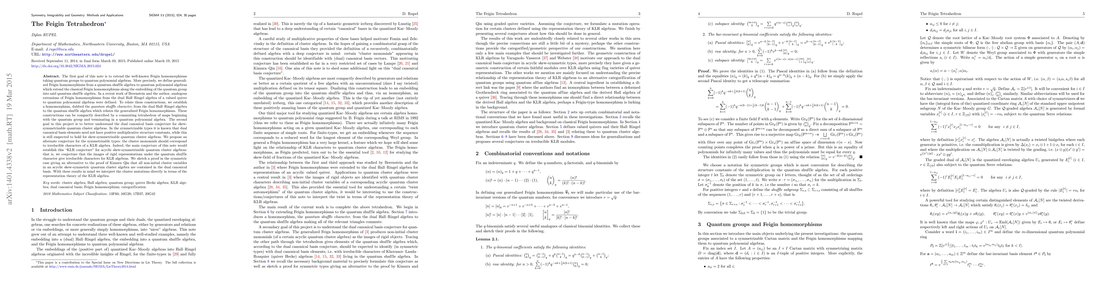 The first goal of this note is to extend the well-known Feigin homomorphisms taking quantum groups to quantum polynomial algebras. More precisely, we define generalized Feigin homomorphisms from a quantum shuffle algebra to quantum polynomial algebras which extend the classical Feigin homomorphisms along the embedding of the quantum group into said quantum shuffle algebra. In a recent work of Berenstein and the author, analogous extensions of Feigin homomorphisms from the dual Hall-Ringel algebra of a valued quiver to quantum polynomial algebras were defined. To relate these constructions, we establish a homomorphism, dubbed the quantum shuffle character, from the dual Hall-Ringel algebra to the quantum shuffle algebra which relates the generalized Feigin homomorphisms. These constructions can be compactly described by a commuting tetrahedron of maps beginning with the quantum group and terminating in a quantum polynomial algebra. The second goal in this project is to better understand the dual canonical basis conjecture for skew-symmetrizable quantum cluster algebras. In the symmetrizable types it is known that dual canonical basis elements need not have positive multiplicative structure constants, while this is still suspected to hold for skew-symmetrizable quantum cluster algebras. We propose an alternate conjecture for the symmetrizable types: the cluster monomials should correspond to irreducible characters of a KLR algebra. Indeed, the main conjecture of this note would establish this "KLR conjecture" for acyclic skew-symmetrizable quantum cluster algebras: that is, we conjecture that the images of rigid representations under the quantum shuffle character give irreducible characters for KLR algebras.