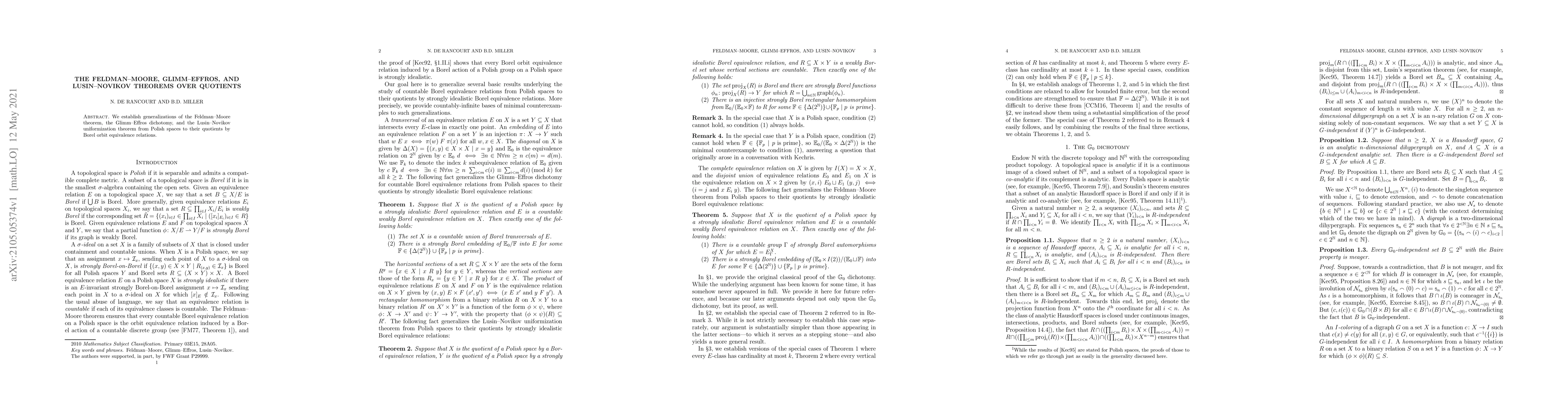 Summary: This paper generalizes three significant theorems in descriptive set theory—the Feldman-Moore, Glimm-Effros dichotomy, and Lusin-Novikov uniformization—from Polish spaces to their quotients under Borel orbit equivalence relations. The results extend foundational concepts to a broader mathematical context.