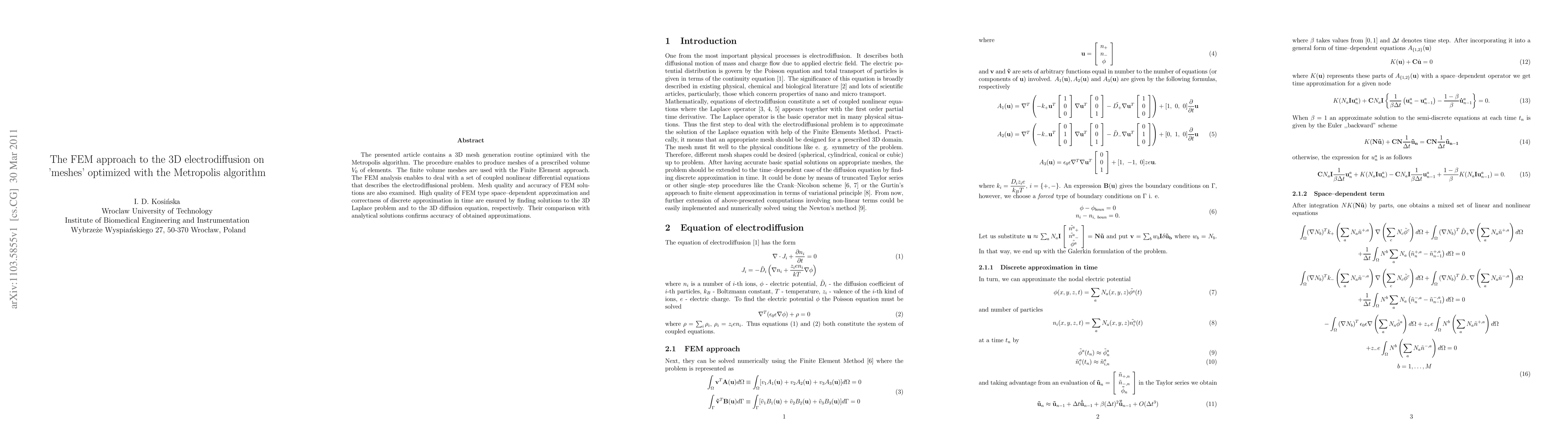 The presented article contains a 3D mesh generation routine optimized with the Metropolis algorithm. The procedure enables to produce meshes of a prescribed volume V_0 of elements. The finite volume meshes are used with the Finite Element approach. The FEM analysis enables to deal with a set of coupled nonlinear differential equations that describes the electrodiffusional problem. Mesh quality and accuracy of FEM solutions are also examined. High quality of FEM type space-dependent approximation and correctness of discrete approximation in time are ensured by finding solutions to the 3D Laplace problem and to the 3D diffusion equation, respectively. Their comparison with analytical solutions confirms accuracy of obtained approximations.