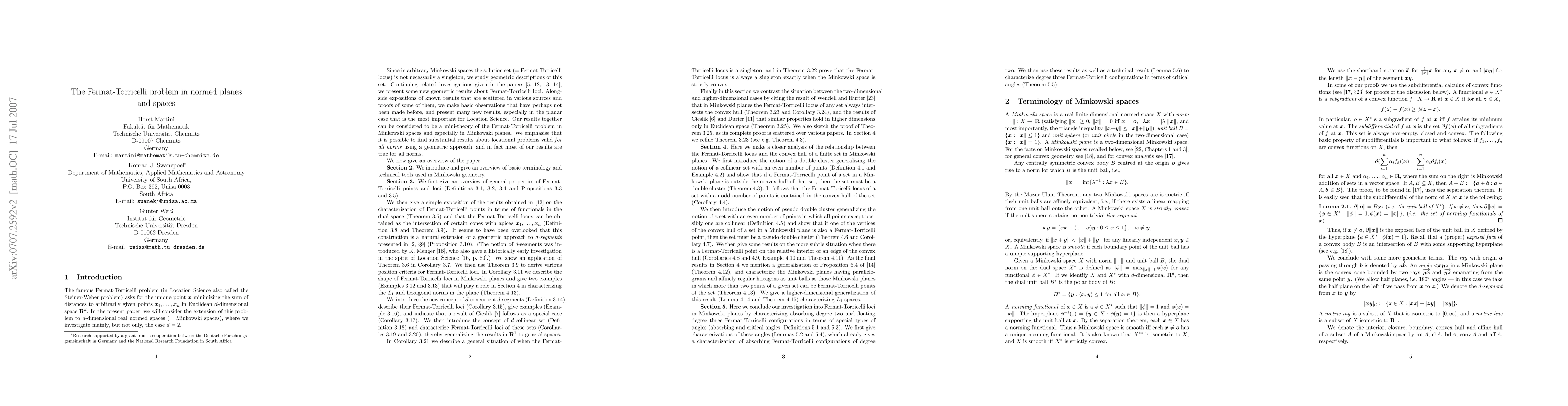 This paper explores the Fermat-Torricelli problem—finding the optimal location minimizing total distance to given points—in d-dimensional normed spaces, with a focus on 2D Minkowski planes. It presents new results and consolidates existing findings with proofs, establishing a minitheory of the problem in these spaces and demonstrating the effectiveness of a geometric approach.