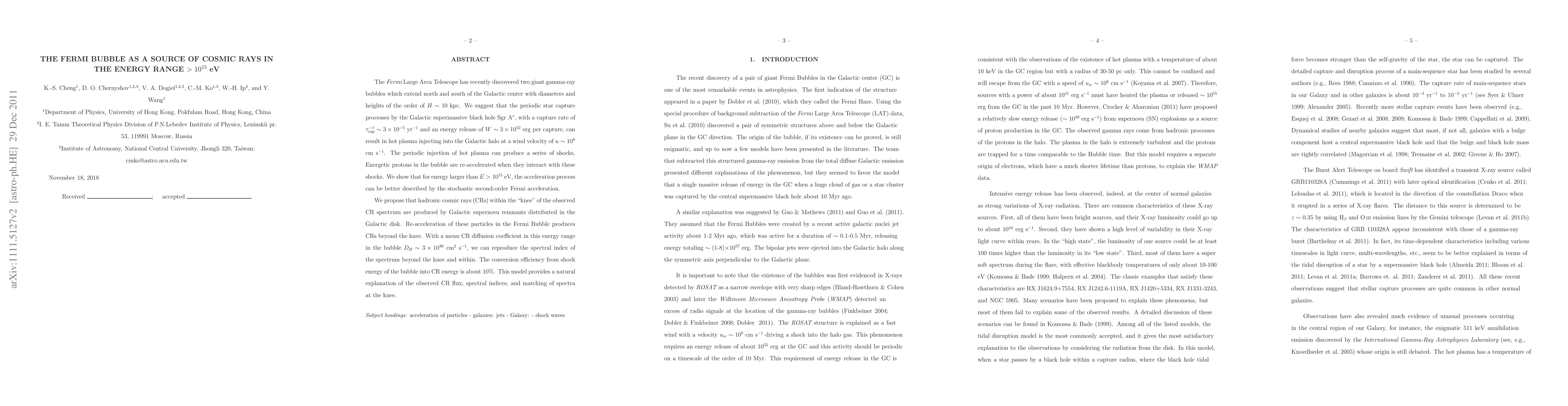 The {\it Fermi} Large Area Telescope has recently discovered two giant gamma-ray bubbles which extend north and south of the Galactic center with diameters and heights of the order of $H\sim 10$ kpc. We suggest that the periodic star capture processes by the Galactic supermassive black hole Sgr A$^*$, with a capture rate of $\tau_{\rm cap}^{-1}\sim 3\times 10^{-5}$ yr$^{-1}$ and an energy release of $W\sim 3\times 10^{52}$ erg per capture, can result in hot plasma injecting into the Galactic halo at a wind velocity of $u\sim 10^8$ cm s$^{-1}$. The periodic injection of hot plasma can produce a series of shocks. Energetic protons in the bubble are re-accelerated when they interact with these shocks. We show that for energy larger than $E> 10^{15}$ eV, the acceleration process can be better described by the stochastic second-order Fermi acceleration. We propose that hadronic cosmic rays (CRs) within the ``knee'' of the observed CR spectrum are produced by Galactic supernova remnants distributed in the Galactic disk. Re-acceleration of these particles in the Fermi Bubble produces CRs beyond the knee. With a mean CR diffusion coefficient in this energy range in the bubble $D_B\sim 3\times 10^{30}$ cm$^2$ s$^{-1}$, we can reproduce the spectral index of the spectrum beyond the knee and within. The conversion efficiency from shock energy of the bubble into CR energy is about 10\%. This model provides a natural explanation of the observed CR flux, spectral indices, and matching of spectra at the knee.