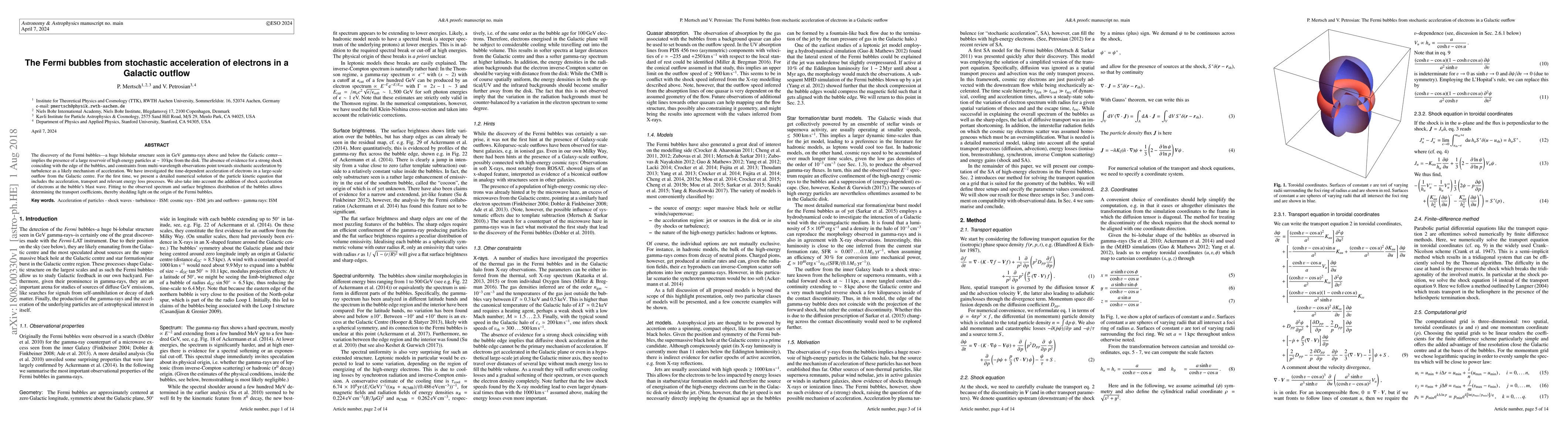 The Fermi bubbles, a large bilobular gamma-ray structure above and below the Galactic center, are likely formed by stochastic acceleration of electrons in a Galactic outflow, as evidenced by numerical simulations and multi-wavelength observations. The study provides a detailed solution for electron acceleration, transport, and energy loss, revealing the transport coefficients that explain the bubbles' origin.