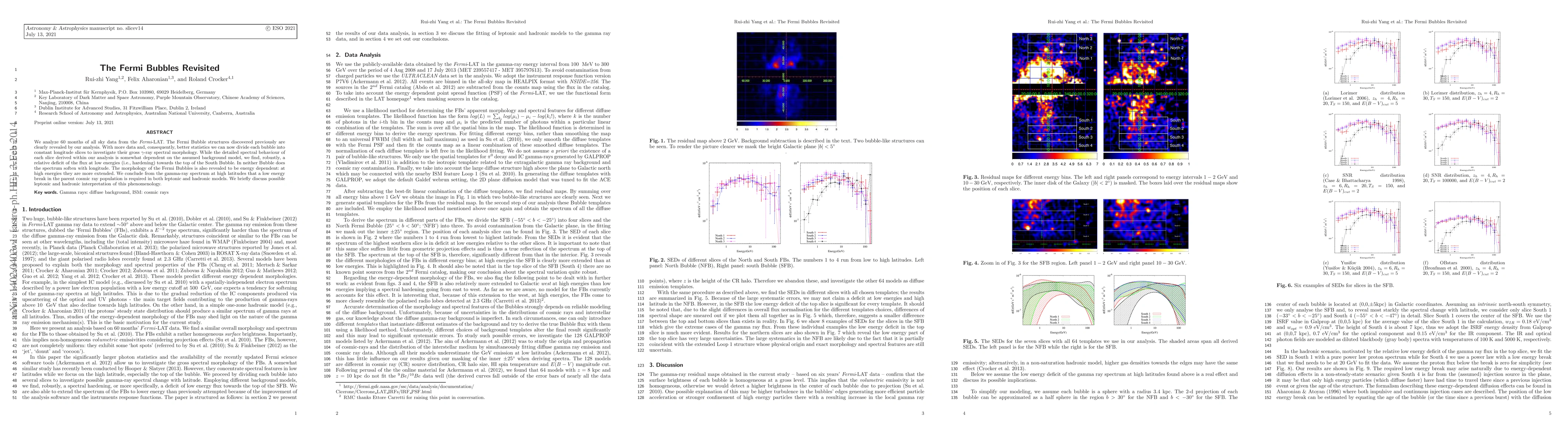 The paper revisits Fermi Bubbles using 60 months of Fermi-LAT all-sky data, revealing their structures more clearly. It finds a low energy flux deficit (hardening) towards the top of the South Bubble, and energy-dependent morphology, with higher energy bubbles being more extended. Both leptonic and hadronic models necessitate a low energy break in the parent cosmic ray population to explain the gamma-ray spectrum at high latitudes.