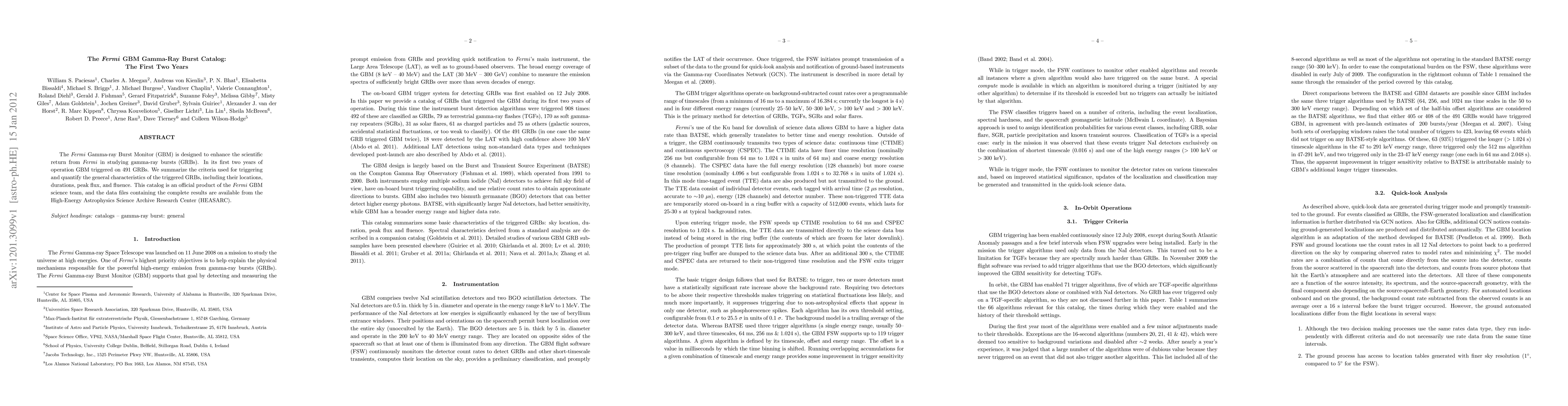 The Fermi GBM Gamma-Ray Burst Catalog details the first two years of data from the Fermi Gamma-ray Burst Monitor, which detected 491 gamma-ray bursts, providing comprehensive statistics on their characteristics such as location, duration, peak flux, and fluence. The complete dataset is available for research through the High-Energy Astrophysics Science Archive Research Center.