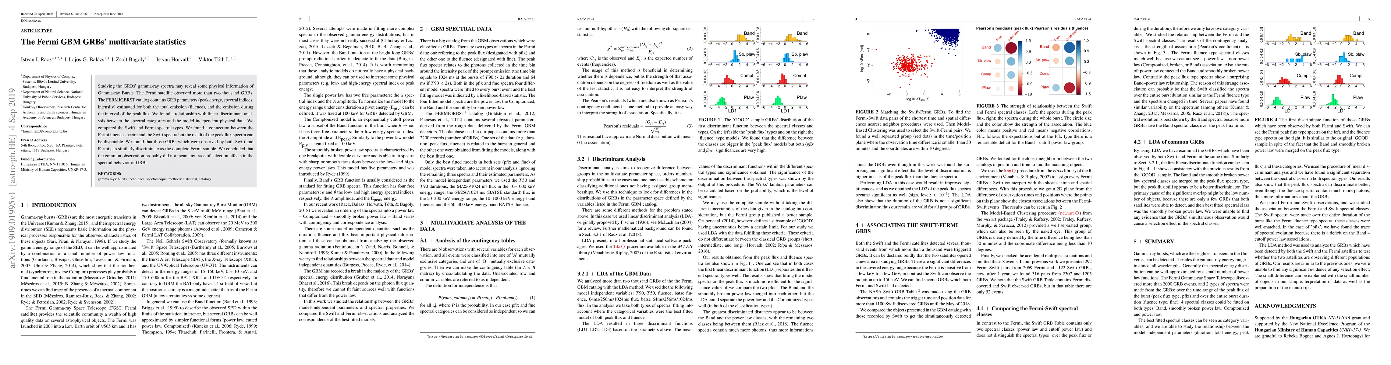 This study analyzes the multivariate statistics of gamma-ray bursts (GRBs) observed by the Fermi satellite, revealing a relationship between spectral categories and physical data using linear discriminant analysis. The research finds a connection between Fermi and Swift GRB spectra but notes disputable results for peak flux spectra, concluding no selection effects in spectral behavior from common observations.