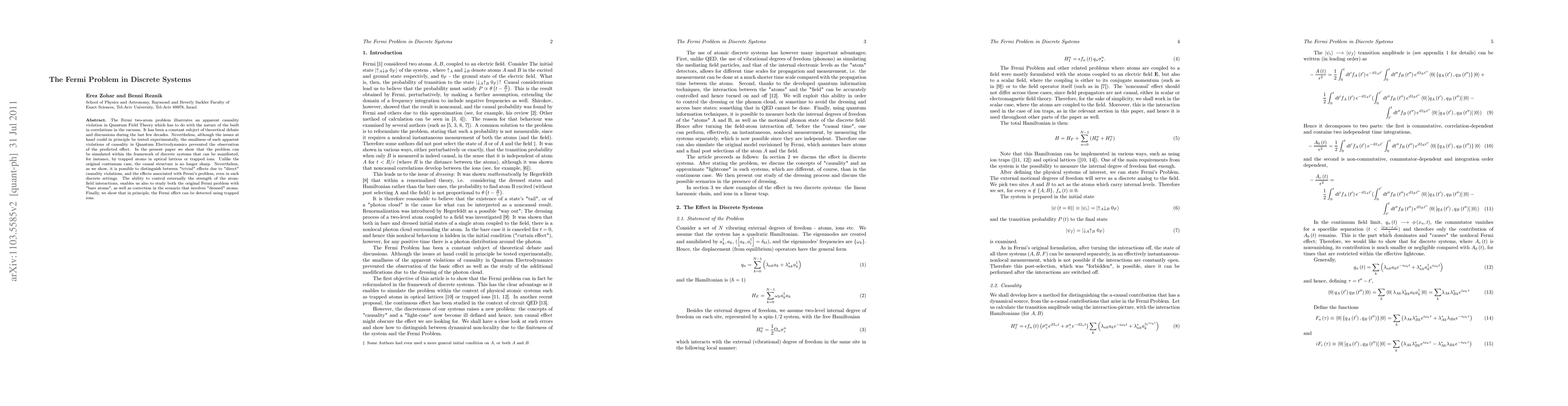 The Fermi two-atom problem illustrates an apparent causality violation in Quantum Field Theory which has to do with the nature of the built in correlations in the vacuum. It has been a constant subject of theoretical debate and discussions during the last few decades. Nevertheless, although the issues at hand could in principle be tested experimentally, the smallness of such apparent violations of causality in Quantum Electrodynamics prevented the observation of the predicted effect. In the present paper we show that the problem can be simulated within the framework of discrete systems that can be manifested, for instance, by trapped atoms in optical lattices or trapped ions. Unlike the original continuum case, the causal structure is no longer sharp. Nevertheless, as we show, it is possible to distinguish between "trivial" effects due to "direct" causality violations, and the effects associated with Fermi's problem, even in such discrete settings. The ability to control externally the strength of the atom-field interactions, enables us also to study both the original Fermi problem with "bare atoms", as well as correction in the scenario that involves "dressed" atoms. Finally, we show that in principle, the Fermi effect can be detected using trapped ions.
