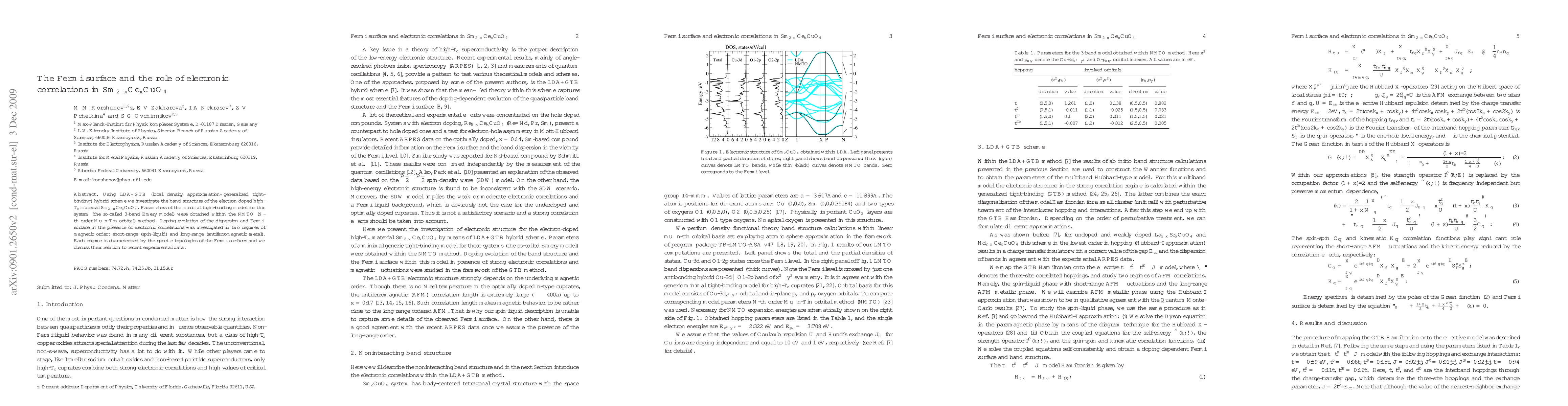 Using LDA+GTB (local density approximation+generalized tight-binding) hybrid scheme we investigate the band structure of the electron-doped high-$T_c$ material Sm$_{2-x}$Ce$_{x}$CuO$_4$. Parameters of the minimal tight-binding model for this system (the so-called 3-band Emery model) were obtained within the NMTO ($N$-th order Muffin-Tin orbital) method. Doping evolution of the dispersion and Fermi surface in the presence of electronic correlations was investigated in two regimes of magnetic order: short-range (spin-liquid) and long-range (antiferromagnetic metal). Each regime is characterized by the specific topologies of the Fermi surfaces and we discuss their relation to recent experimental data.