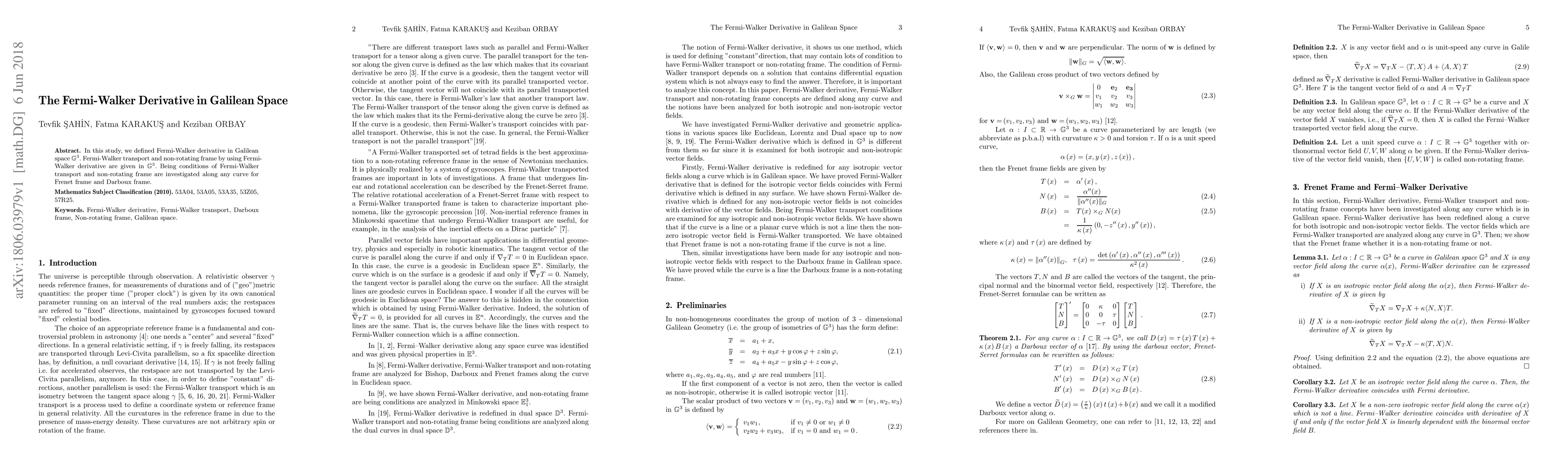 In this study, we defined Fermi-Walker derivative in Galilean space $\mathbb{G}^3$. Fermi-Walker transport and non-rotating frame by using Fermi- Walker derivative are given in $\mathbb{G}^3$. Being conditions of Fermi-Walker transport and non-rotating frame are investigated along any curve for Frenet frame and Darboux frame.