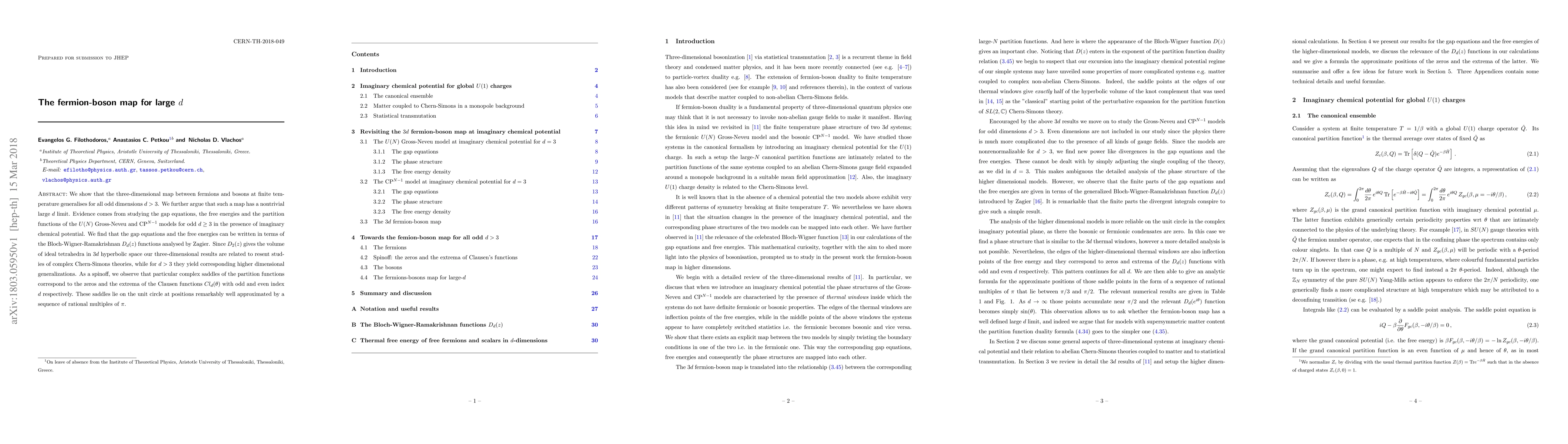 Researchers extend the fermion-boson map to odd dimensions d > 3, finding a nontrivial large d limit with implications for complex Chern-Simons theories and partition functions.