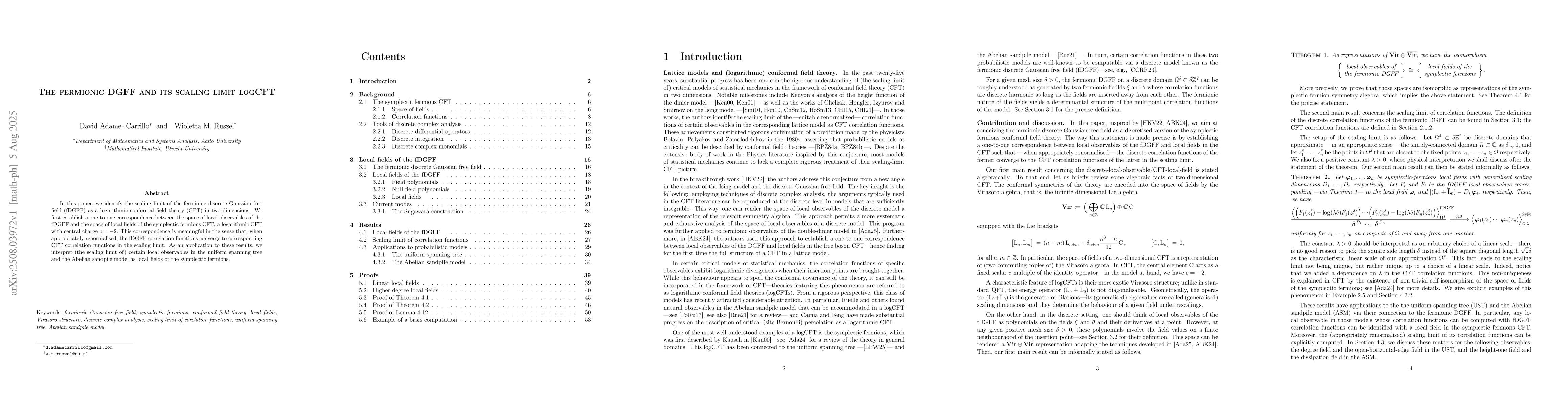 In this paper, we identify the scaling limit of the fermionic discrete Gaussian free field (fDGFF) as a logarithmic conformal field theory (CFT) in two dimensions. We first establish a one-to-one correspondence between the space of local observables of the fDGFF and the space of local fields of the symplectic fermions CFT, a logarithmic CFT with central charge $c = - 2$. This correspondence is meaningful in the sense that, when appropriately renormalised, the fDGFF correlation functions converge to corresponding CFT correlation functions in the scaling limit. As an application to these results, we interpret (the scaling limit of) certain local observables in the uniform spanning tree and the Abelian sandpile model as local fields of the symplectic fermions.
