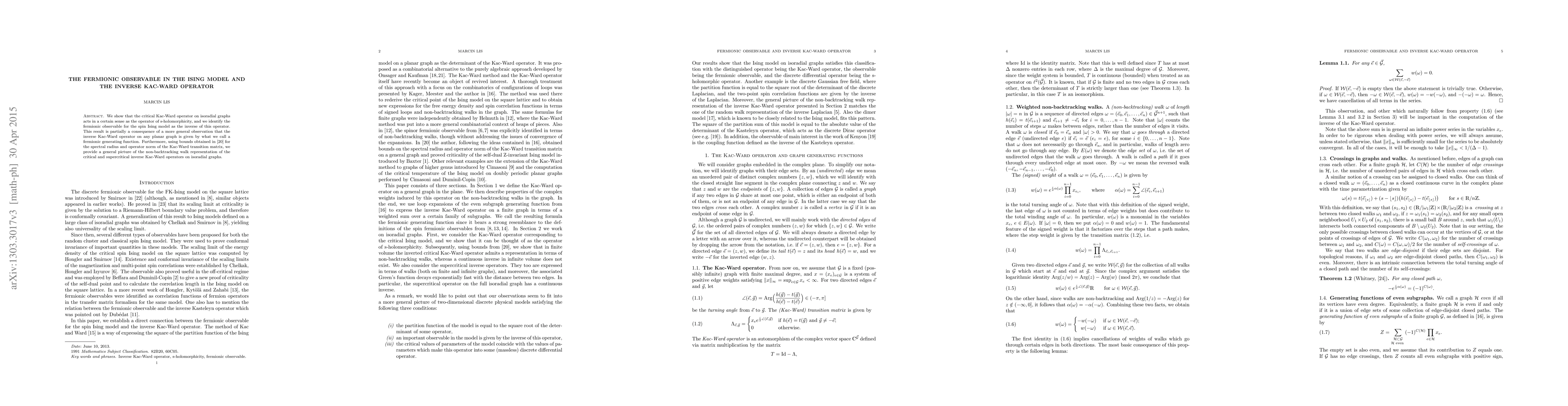 This paper demonstrates that the critical Kac-Ward operator in the Ising model functions as an operator of s-holomorphicity and identifies the fermionic observable as its inverse. It also establishes a general framework for the inverse Kac-Ward operator using fermionic generating functions on planar graphs.