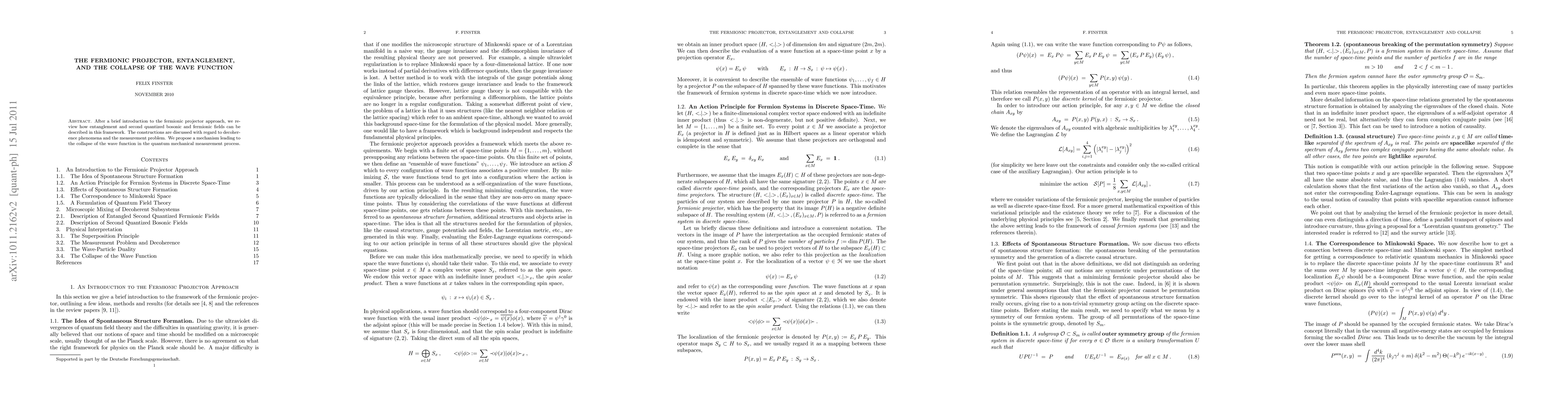 After a brief introduction to the fermionic projector approach, we review how entanglement and second quantized bosonic and fermionic fields can be described in this framework. The constructions are discussed with regard to decoherence phenomena and the measurement problem. We propose a mechanism leading to the collapse of the wave function in the quantum mechanical measurement process.