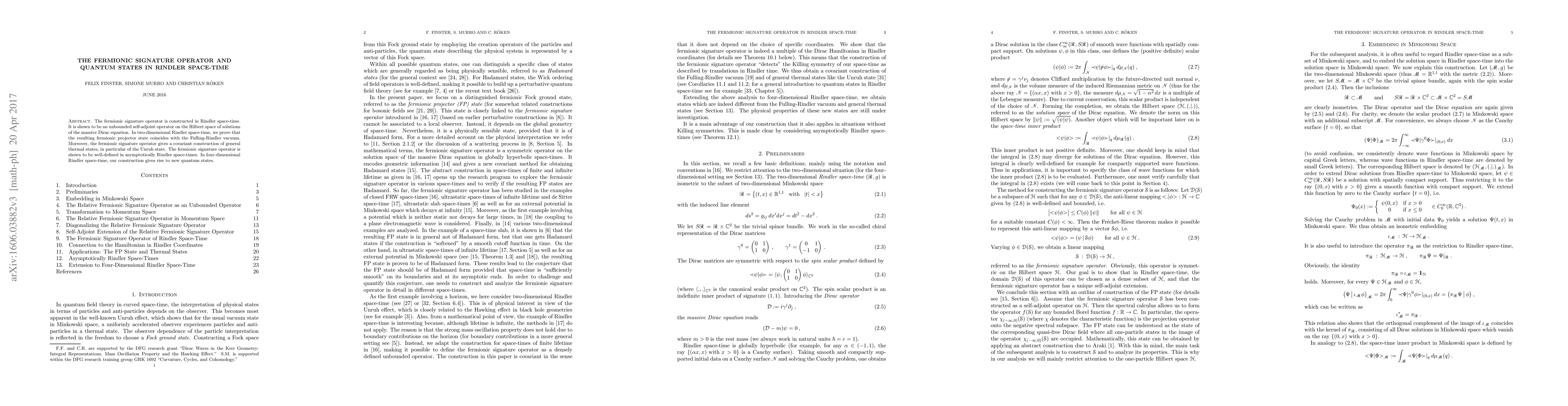 The fermionic signature operator is constructed in Rindler space-time. It is shown to be an unbounded self-adjoint operator on the Hilbert space of solutions of the massive Dirac equation. In two-dimensional Rindler space-time, we prove that the resulting fermionic projector state coincides with the Fulling-Rindler vacuum. Moreover, the fermionic signature operator gives a covariant construction of general thermal states, in particular of the Unruh state. The fermionic signature operator is shown to be well-defined in asymptotically Rindler space-times. In four-dimensional Rindler space-time, our construction gives rise to new quantum states.