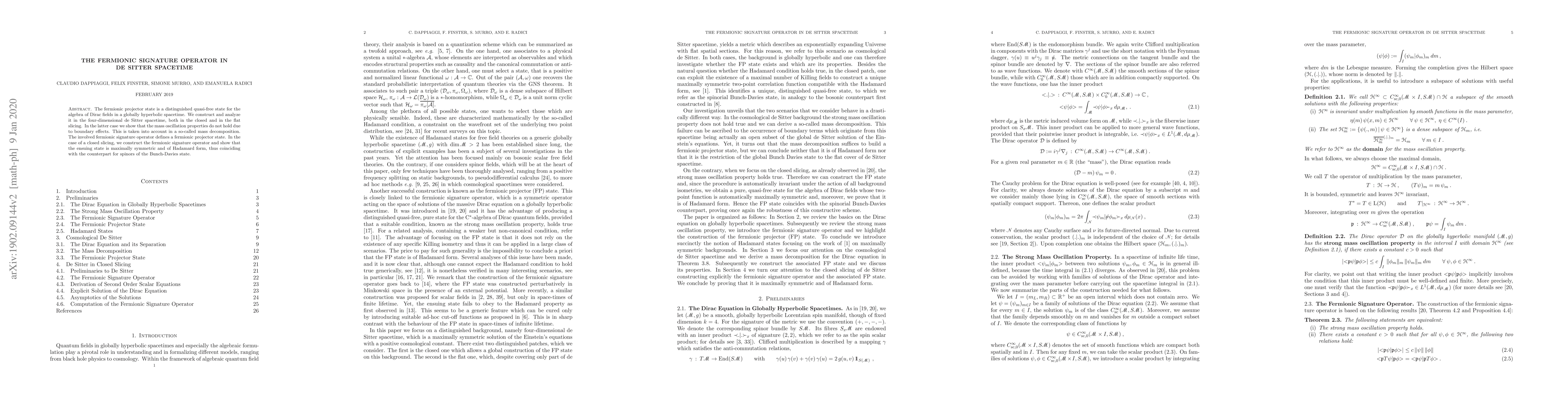 The fermionic projector state is a distinguished quasi-free state for the algebra of Dirac fields in a globally hyperbolic spacetime. We construct and analyze it in the four-dimensional de Sitter spacetime, both in the closed and in the flat slicing. In the latter case we show that the mass oscillation properties do not hold due to boundary effects. This is taken into account in a so-called mass decomposition. The involved fermionic signature operator defines a fermionic projector state. In the case of a closed slicing, we construct the fermionic signature operator and show that the ensuing state is maximally symmetric and of Hadamard form, thus coinciding with the counterpart for spinors of the Bunch-Davies state.