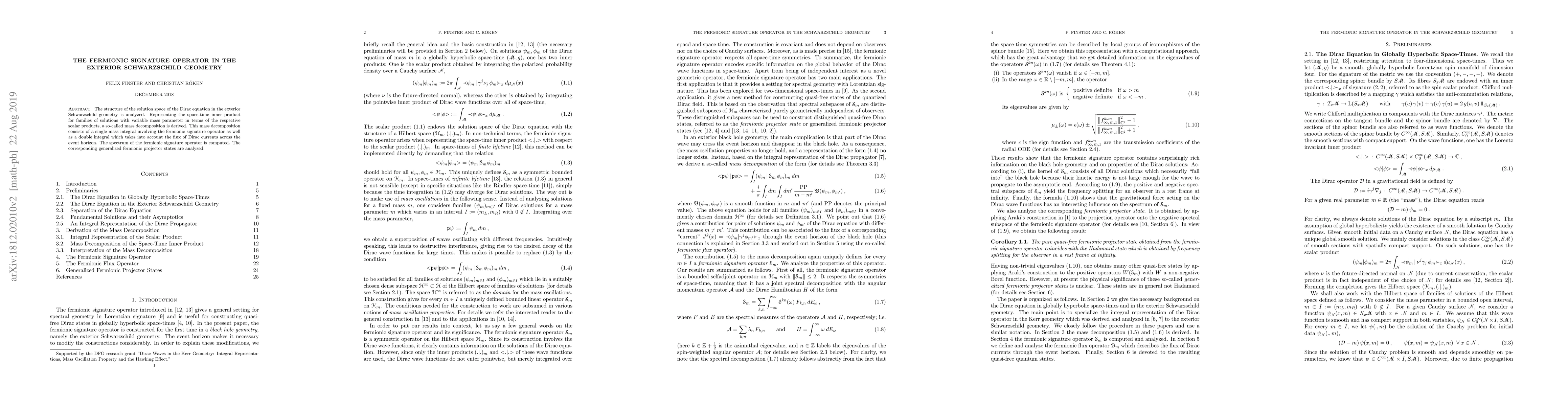 This paper analyzes the Dirac equation in the exterior Schwarzschild geometry, deriving a mass decomposition involving the fermionic signature operator and Dirac current flux. The spectrum of the fermionic signature operator is computed, and generalized fermionic projector states are examined.