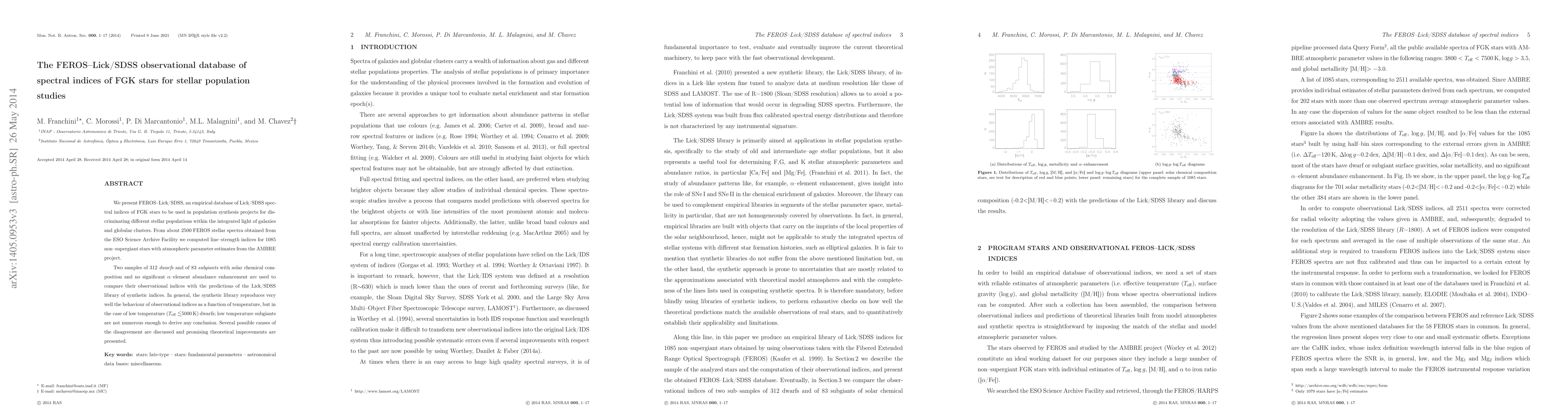 This paper introduces FEROS--Lick/SDSS, an empirical database of spectral indices for FGK stars derived from FEROS stellar spectra, aimed at aiding population synthesis studies. It compares observational indices from 312 dwarfs and 83 subgiants with synthetic indices, finding good agreement overall but noting discrepancies in low-temperature subgiants.